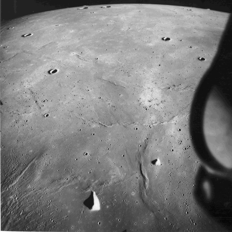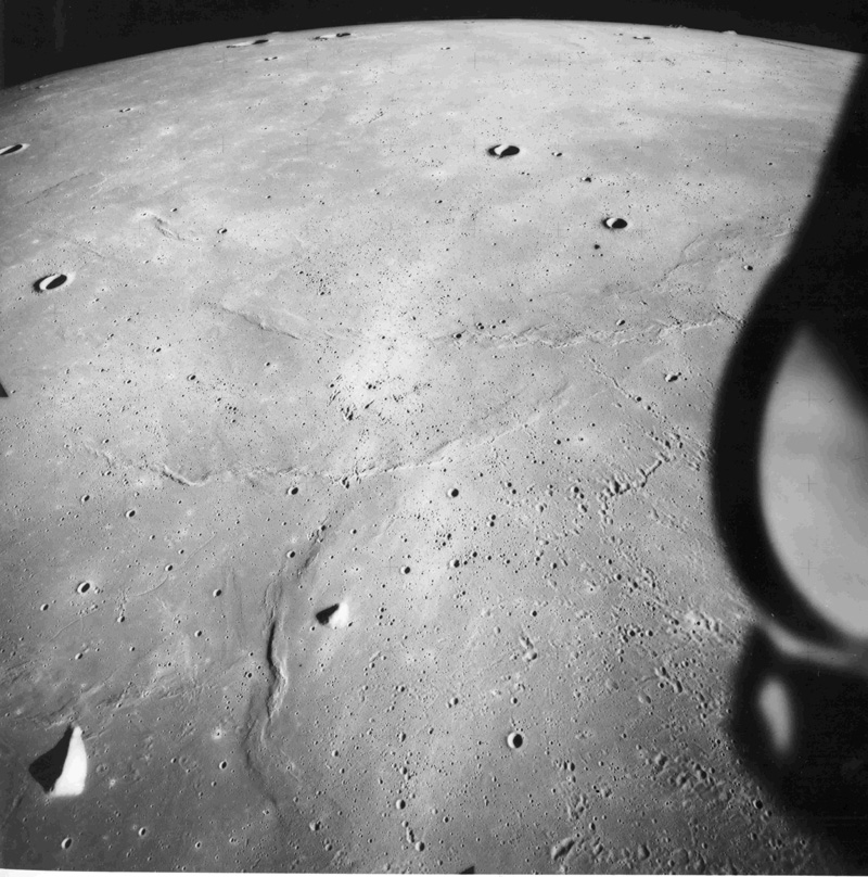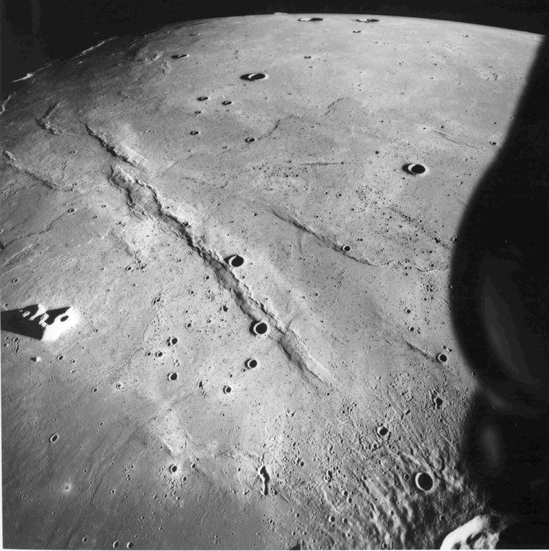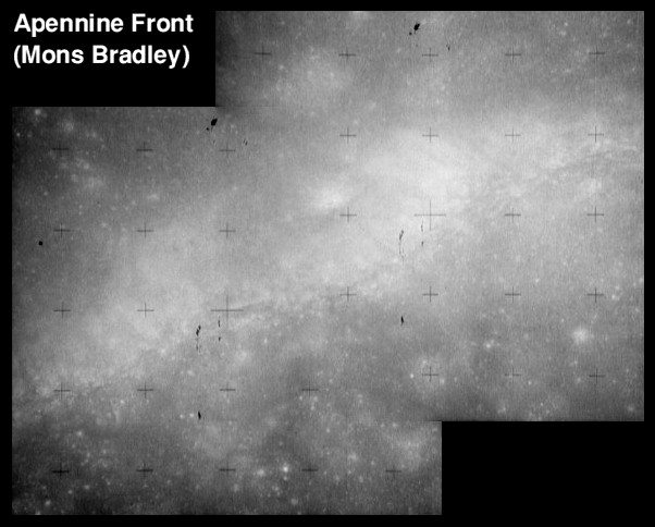 Palus Putredinus with one of the peaks of the Apennine Front to the south. Rima Bradley, a graben-type rille, is near the centre of the frame.AS15-9800P.jpg (1.29 MB)
