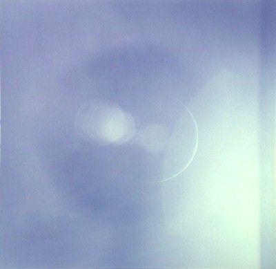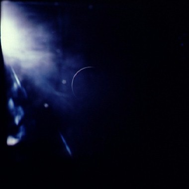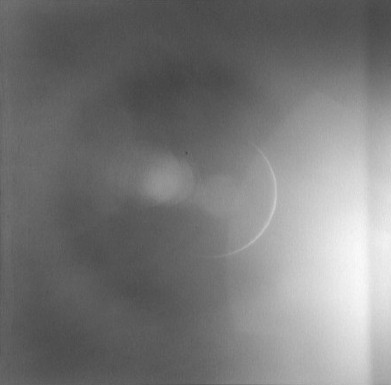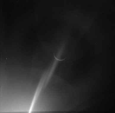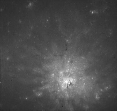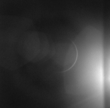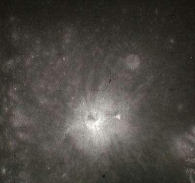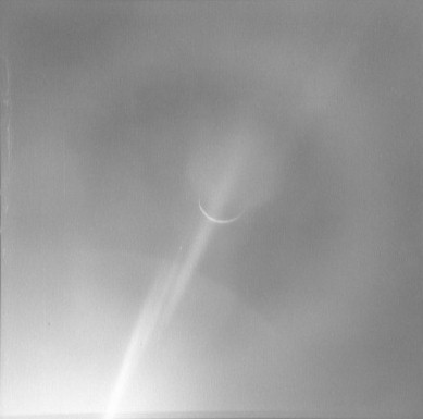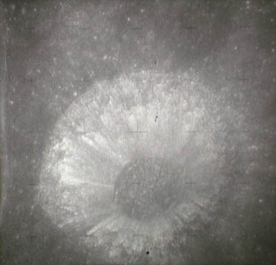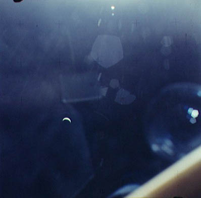 Earth, barely discernible. The proximity of the Sun to the camera's field of view is apparent in this frame with the Earth barely visible as a faint crescent in the central iris reflection.AS15-99-13482.jpg (16k)