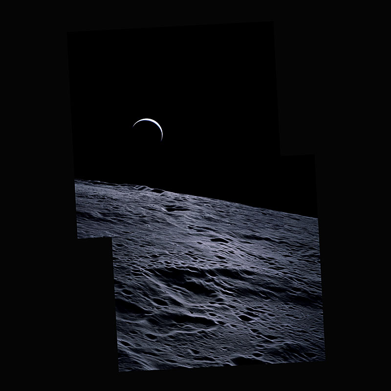 Composite image of crescent Earth rising above Curie Crater.agricola.jpg (98k)