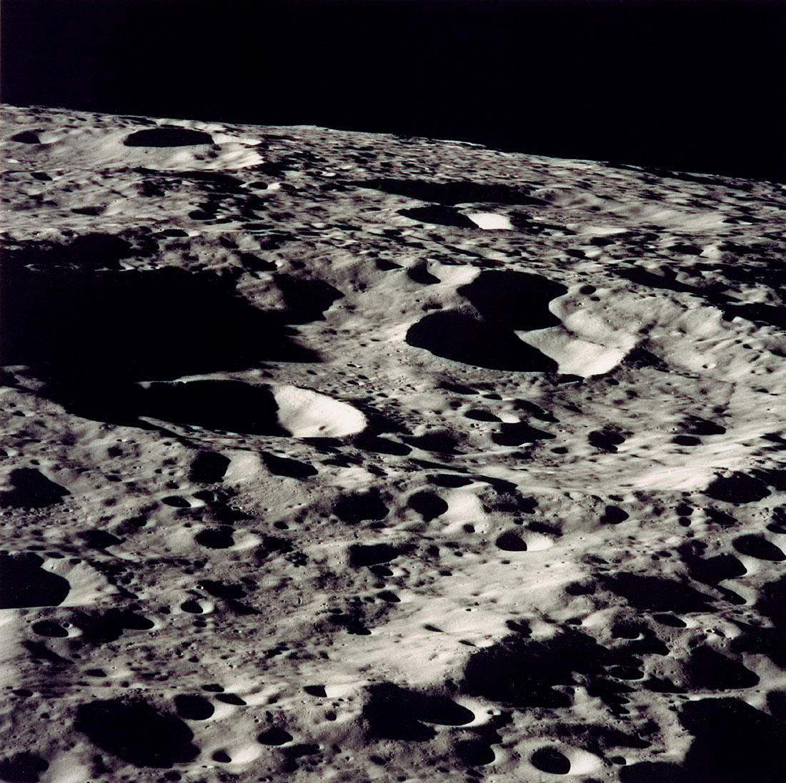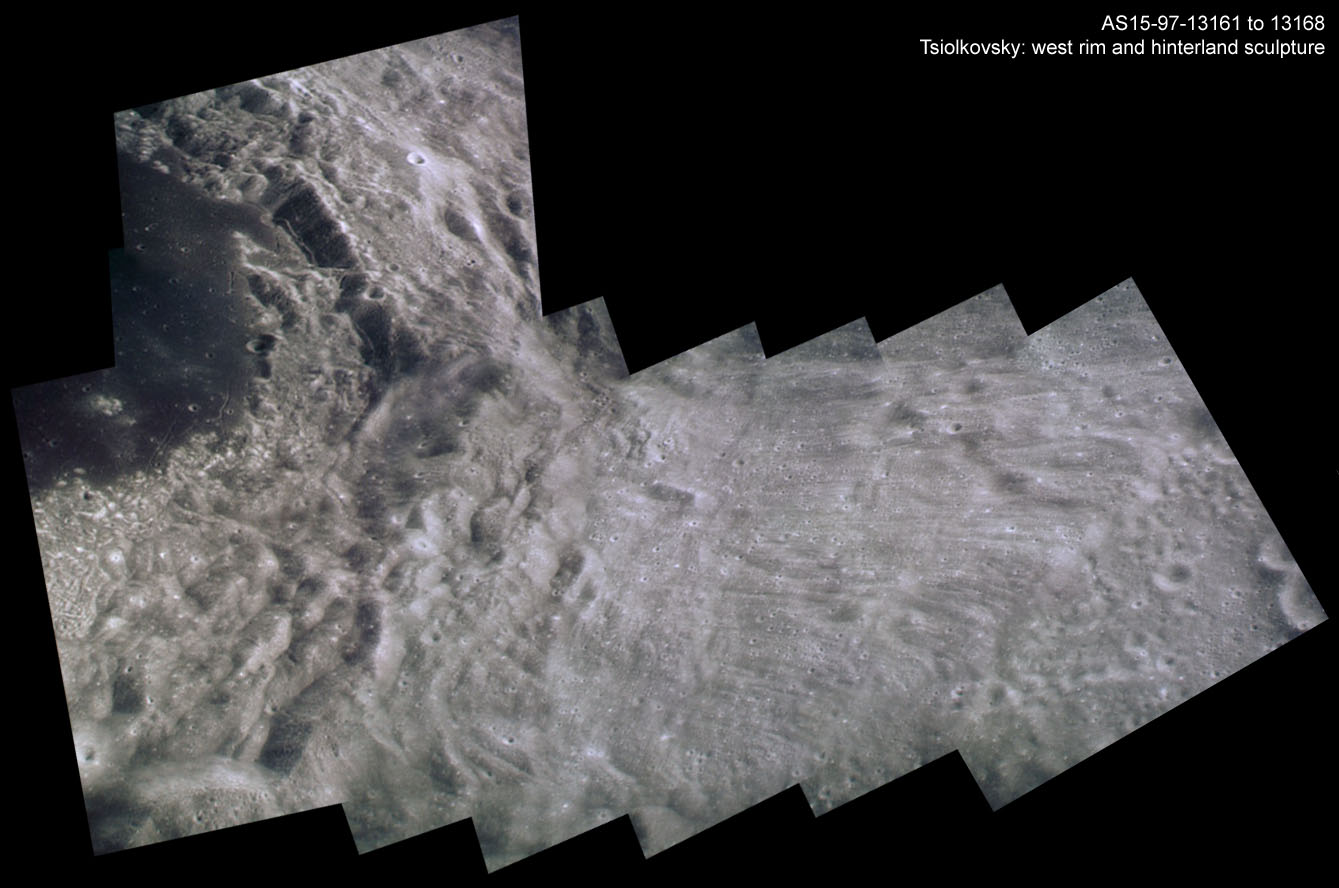 The dark floor and west rim of Tsiolkovsky Crater, and furrowed ground beyond. Composite of frames AS15-97-13161 to 13168.