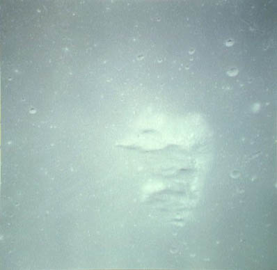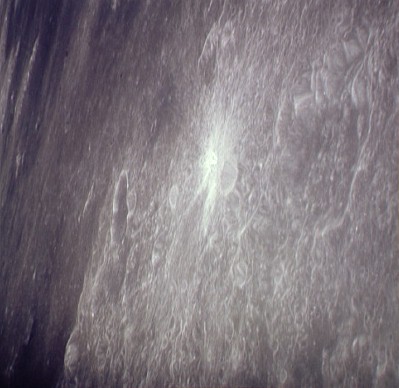 This picture freezes the dramatic instant of splashdown at 20:45 GMT on August 7, 1971, and reveals the Command Module pounding a textbook-perfect impact crater into the water of the Pacific Ocean. Liquid crater ejecta flies radially from the impact site. The Command Module landed more heavily than usual owing to the failure of one of its parachutes to open (32 feet per second; normally 28 fps under three inflated canopies).AP15-71-H-1242.jpg (91k)