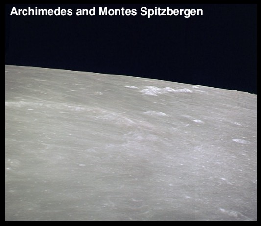 Archimedes Crater and the Spitzbergen Mountains. Composite of frames AS15-97-13233 and 13234.timocharis.jpg (62k)