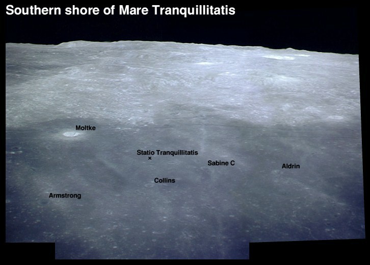 Labelled view of Tranquillity Base ("Statio Tranquillitatis"), the Apollo 11 landing site, and surrounding landmark craters, on the southern shore of the Sea of Tranquillity. Composite of frames AS15-97-13284 to 13287.tsiolkovsky-eastrim.jpg (86k)