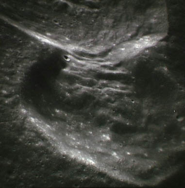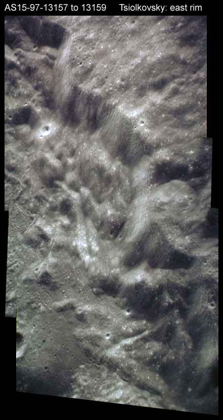 East rim of Tsiolkovsky Crater. Composite of frames AS15-97-13157 to 13159.tsiolkovsky-hinter.jpg (143k)