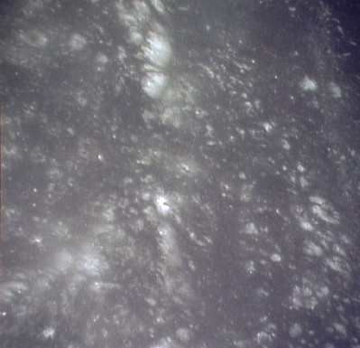 Just east of the landing site with the hummocky landscape between Conon and Galen at the bottom and crater Santos-Dumont at the top. The landing site is about a third way down.AS15-9799P.jpg (932k)