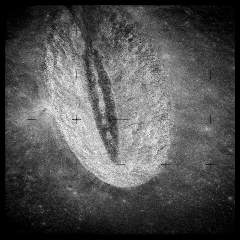Image of Messier Crater donated to the Journal by Michael Light. Frame number 33 from his collection, Full Moon.AS15-81-10869.jpg (21k)