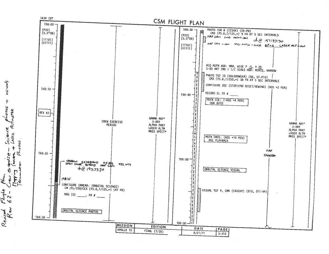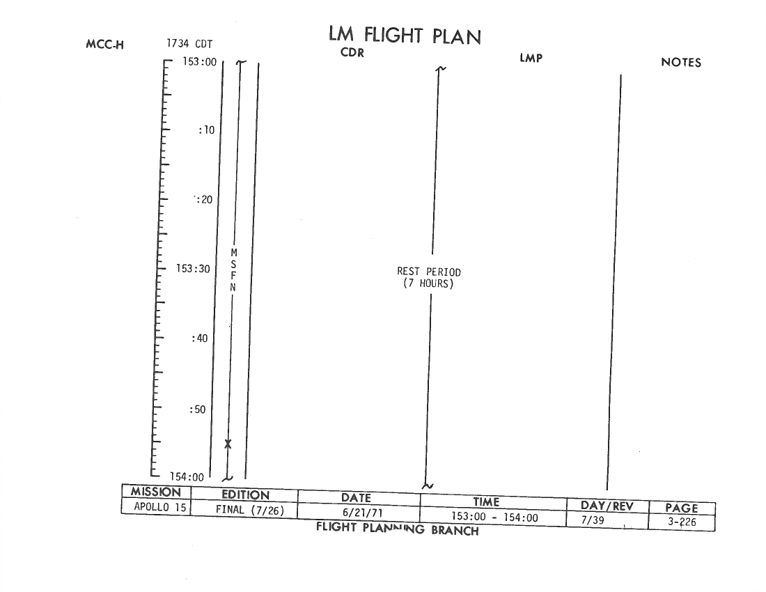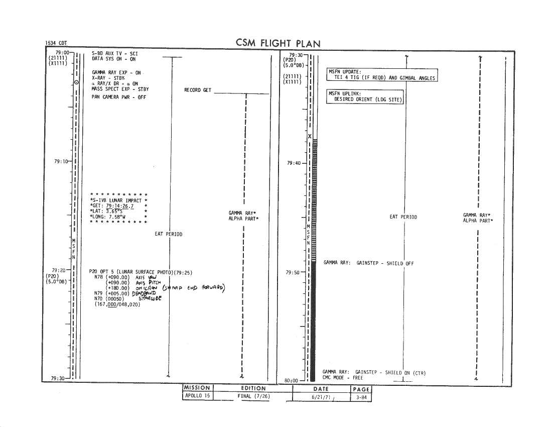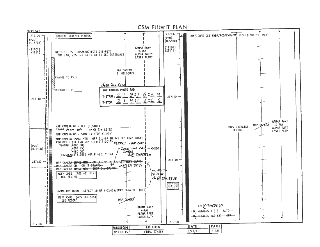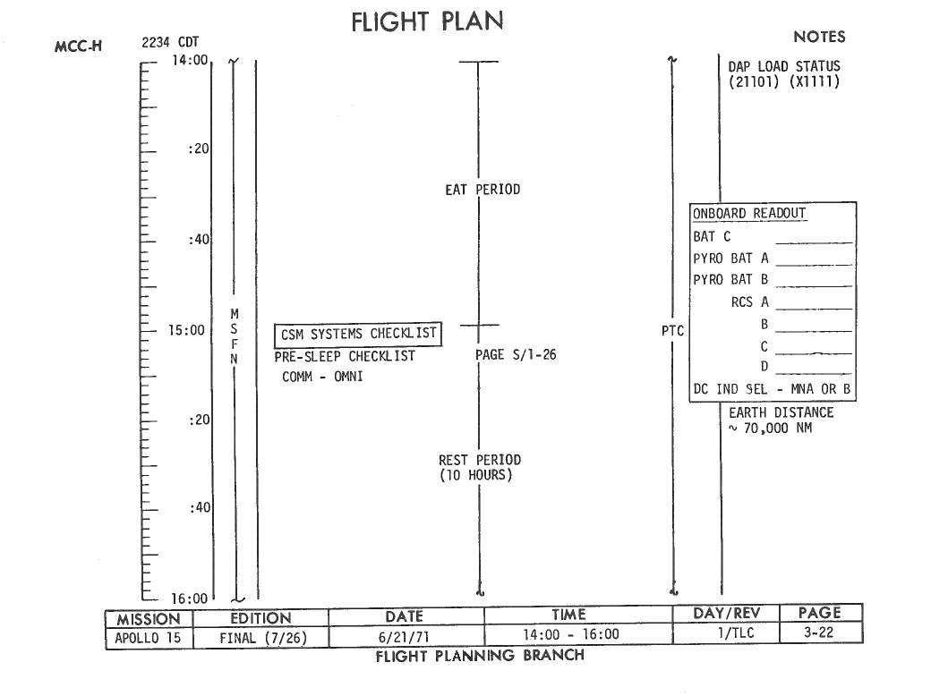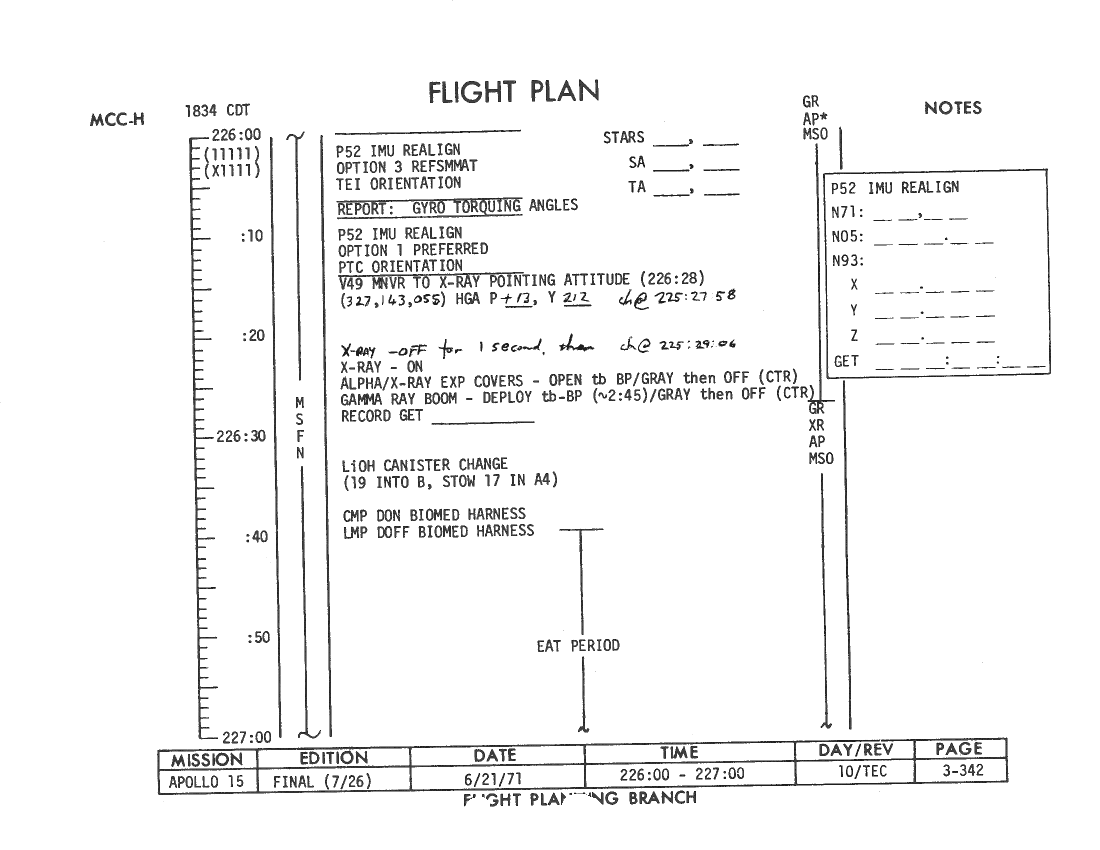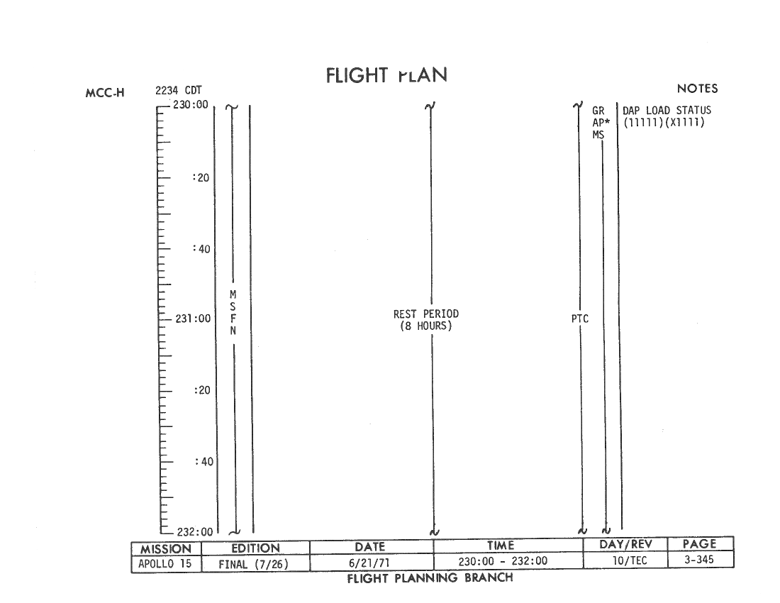 All hand-written additions in this copy of the Flight Plan were made by David Woods during the compilation of this Journal and largely represent the updates read to the crew during the flight.