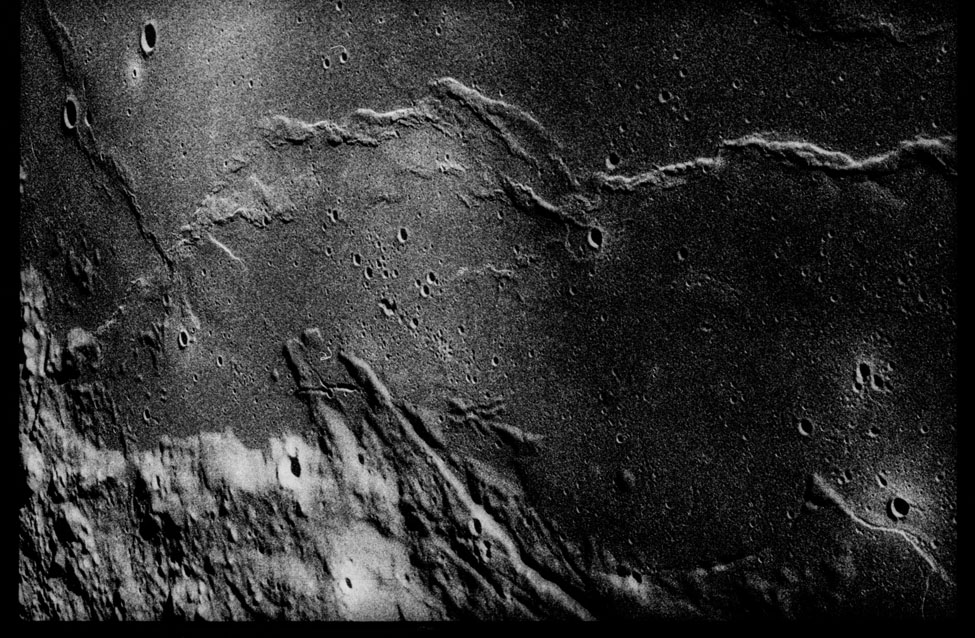 139:48:13 Evans (onboard): In this case, all the swirls seem to be running from west to east, or east to west, as the case may be. They seem to be essentially lined up in that way, like they had blown across and maybe gone around - a low mound or something like that. Concentrating on the cloverleaf - and I'll call that cloverleaf - in the northeastern corner down there, the biggest apparent thing is there, it's quite obvious, that you have lava scarp flowing up and over the - in front of the slump material that has been slumped down inside the crater, at least some of the original base fill. So the lava flow's definitely after that, and it looks like in one area - in what I'll call the south domical structures down there, there's a graben or a flow graben where it has flown - Well, I can't tell if it is in or out of. I am just losing sight of it, now. I'll have to check that out next time around. But I can't tell if it is flowing in or out, but at least it's a breach. There has been a lava flow, either into or out of the south domical feature.