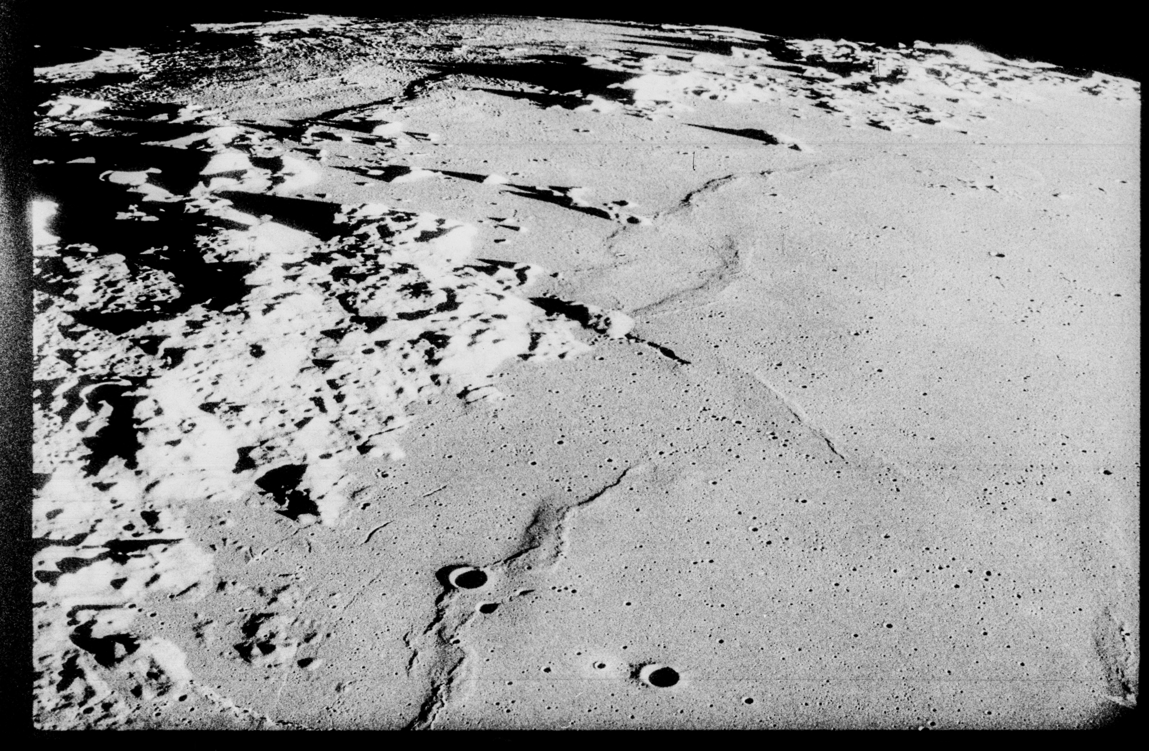 Evans (onboard): I can't get over the curvature. In this attitude, it really shows up. As I come across Rayley [?] here, I keep looking for a swirl. And I can see a definite type of clusters. The only thing - It's an awful high Sun in here to really see any swirls. Now, there is something coming up over the wall of Labachevsky. Yes, it looks like a lighter swirl-type material and then - Let's see - to the west - southwest of Lobachevsky it looks like a heck of a lot of swirl-type material in that area.