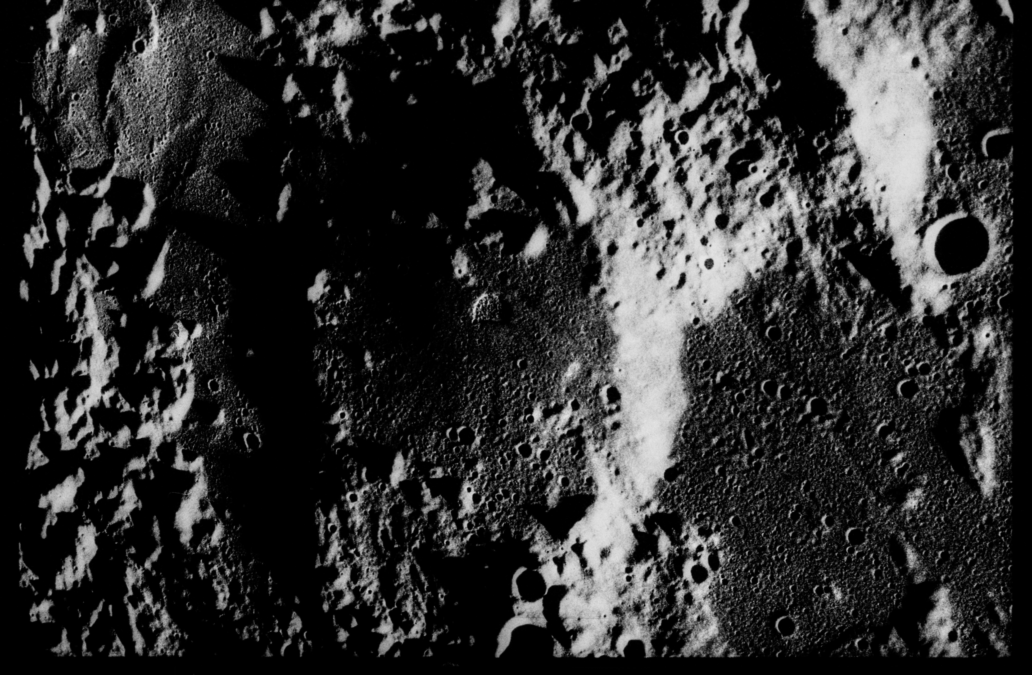 139:49:45 Evans (onboard): There are several, you know, there are subdued craters of some kind, completely subdued or maybe still in that type craters in the north - right south of what we call Crater A. Even there, with the shadow of - Sun angle of, oh, must be no more than 10 degrees, or something like that, or maybe a little bit more. But, you can't see down through that shadow. The western rim is very hard. You lose their shadow down there, and you can't see through the shadow at all.