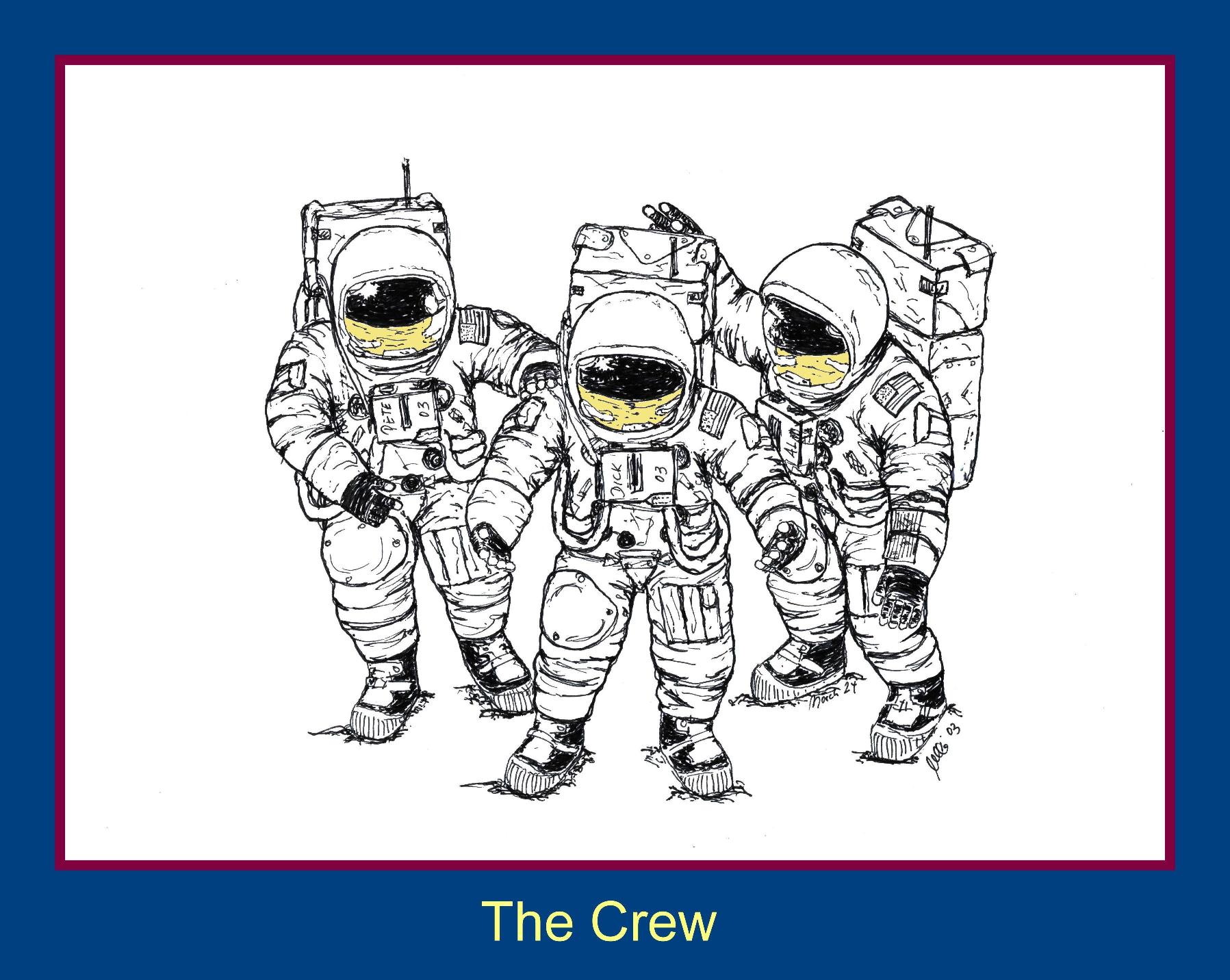 Ulli writes: "Pete Conrad, Dick Gordon and Al Bean - the colorful Prime Crew of Apollo 12 - were all highly-trained Naval Aviators and a very close-knit trio. Three fun-loving boys who are 'friends forever'." "How best to illustrate the spirit of this very special crew? Al Bean has already done it with his great painting Conrad, Gordon and Bean: The Fantasy, so I used Al's motif - sorry Al - and drew Pete, Dick and Al together on the lunar surface, only from a different point-of-view. I've left out Pete and Al's chest-mounted Hasselblad cameras so that I could mark their first names on their RCUs." |