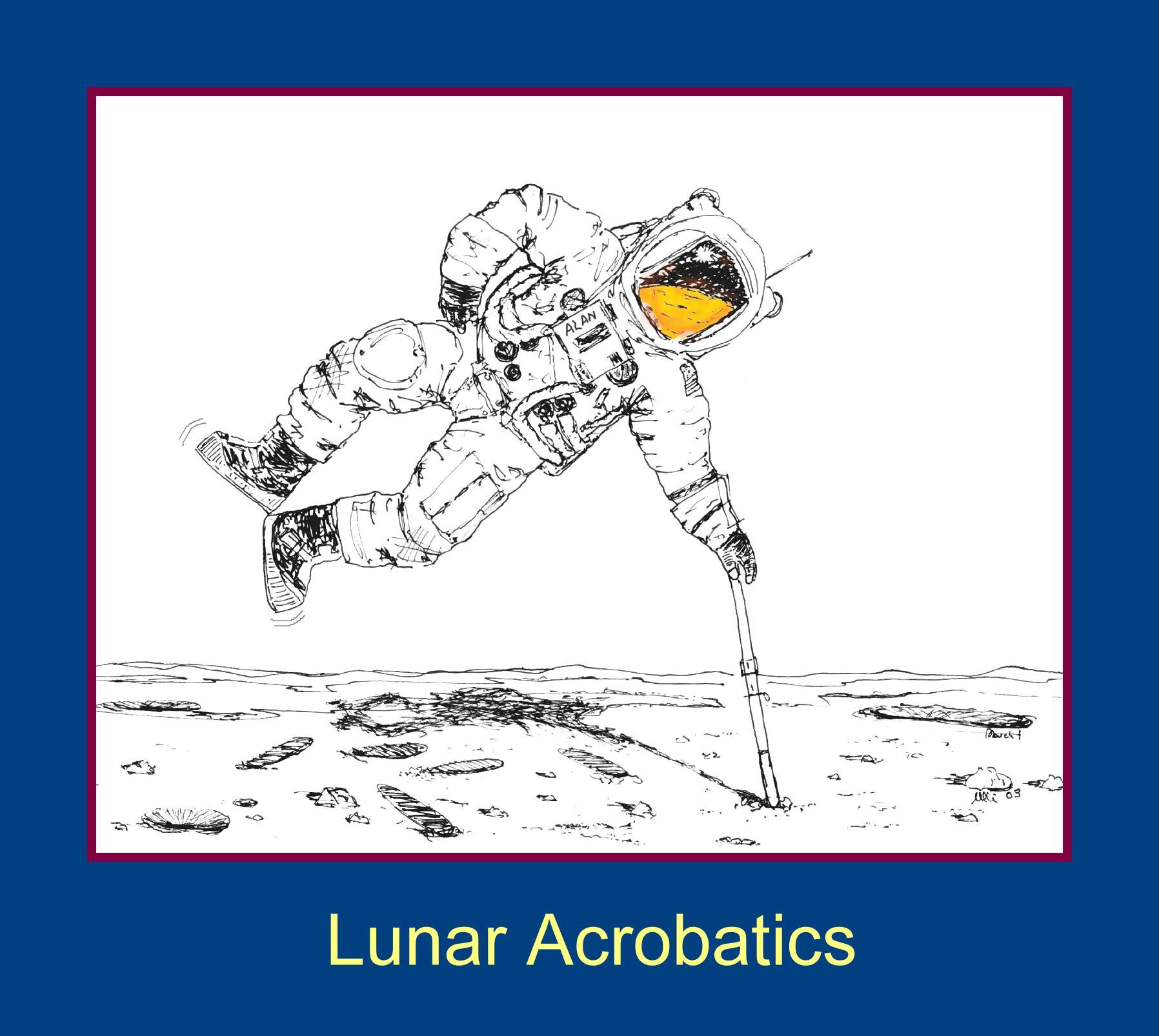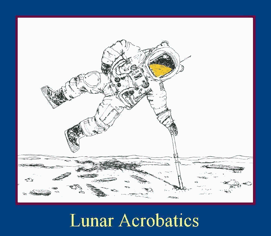 jumping and kicking his heels. Al told me that 'kicking his heels' was a typical way for Pete to show that he was really enjoying life. "The (fantasy) sketch shows Al - not Pete - just after driving a core tube. In this joyfull moment he imitates his CDR's 'kicking the heels', but as a fine and trained athlete in a more acrobatic manner. What a pity that this never happened." Editors's note: We're glad that Al didn't actually try this. As Charlie Duke learned during Apollo 16 when he tried to jump and spin around through a full 360 degrees like an ice skater, it takes practice to do such things in an unfamiliar environment. Charlie lost control and fell heavily on his PLSS - fortunately without damage to anything but his pride. Although we're glad that neither Pete or Al tried anything like this on the Moon, we're very glad that Ulli was able to do it for them! Animated version by Ulli Lotzmann and Ken Glover. |