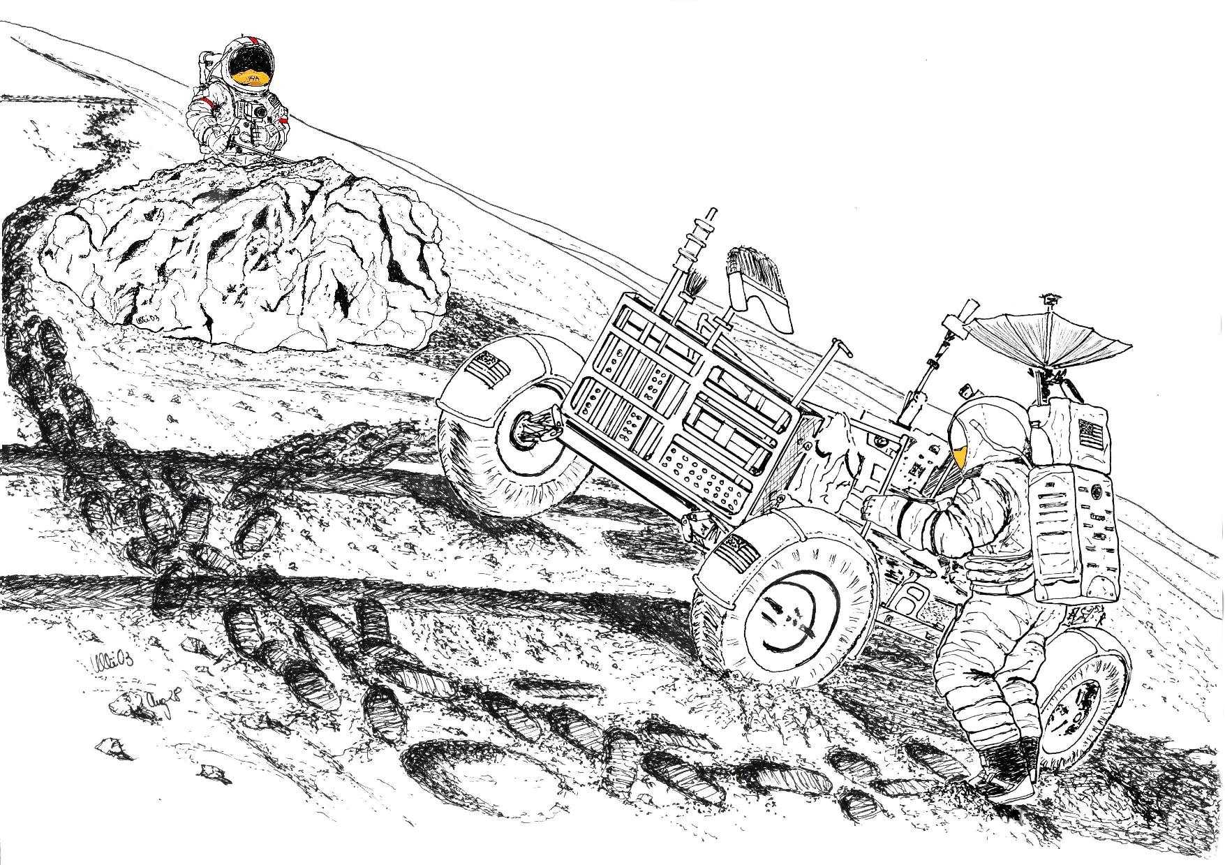After Ulli completed the preliminary version of Jimmy the Brake in late June, we sent a copy to Dave Scott, who had a number of suggestions based on his memories of the scene. This new sketch is the result. Ulli writes, "This sketch is dedicated to my brother Juergen. On Aug 28, when the main part of the sketch was finished, he celebrated his 52nd birthday; and, due to the work on this sketch, I almost missed his party!" From the Apollo 15 Lunar Surface Journal: 145:12:42 Irwin: Oh, you really...Let me hold that Rover and you come up and look at this, because this rock has got green in it, a light green... 145:12:48 Scott: Okay... 145:12:49 Irwin: ...color. Come on. 145:12:50 Scott: Okay; I'll just stand here until you're through... 145:12:51 Irwin: Yeah. 145:12:52 Scott: ...and then I'll go up and take a look at it. 145:12:58 Irwin: The first green rock I've seen. Light green. 145:13:01 Allen: Roger. We're copying all of it. 145:13:04 Irwin: Okay. Where do you want me to hold it? 145:13:07 Scott: Well, just...Come down and stand on your side. 145:13:08 Irwin: On my side? 145:13:09 Scott: Yeah. 145:13:10 Irwin: Okay. [Scott, from a 1996 letter - "Jim's side is downslope, and he can keep it from sliding."]145:13:11 Scott: You stand there and take a break. 145:13:12 Irwin: I'm taking one. 145:13:13 Scott: Okay. (Long Pause while Jim gets positioned) 145:13:26 Irwin: Okay. 145:13:28 Scott: Okay. Are you firmly situated there? 145:13:29 Irwin: Yeah. 145:13:32 Scott: Okay.