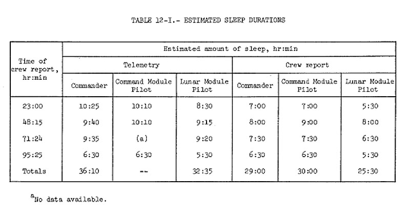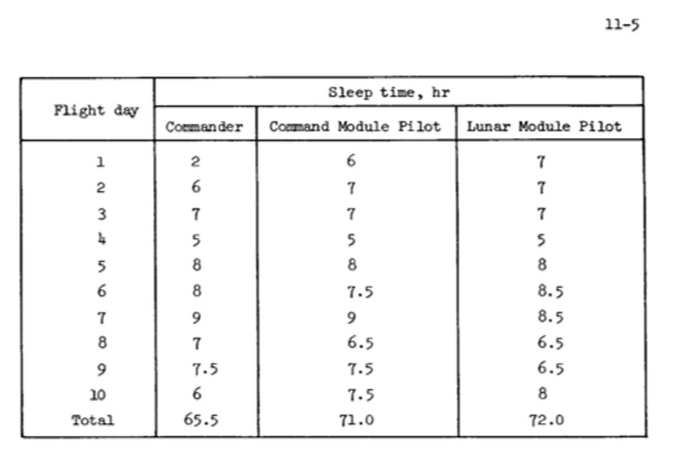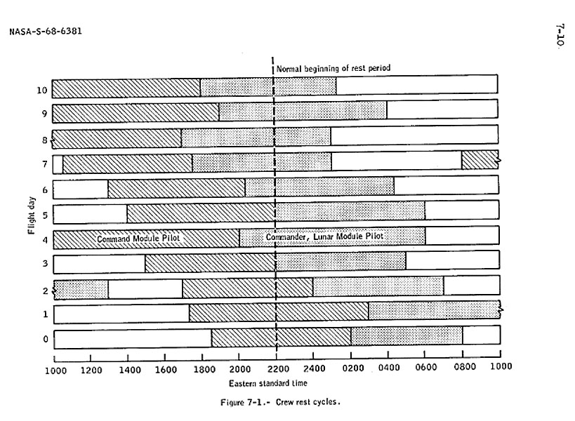 Apollo 8 Mission Report Figure 8-2 showing the large variations in the times of planned sleep periods relative to a 'normal' start of sleep at 2300 at the Cape. These variations were due to the work load of this first voyage to lunar orbit.