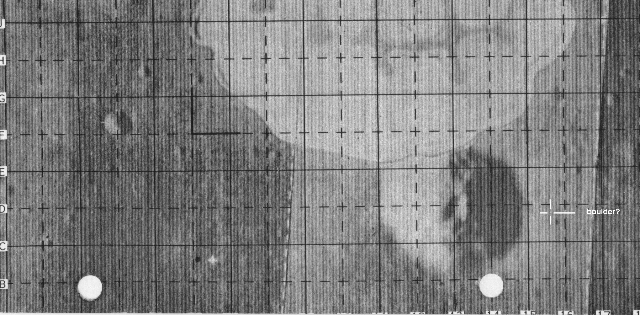 [Apollo 11 photograph AS11-40-5921 shows the area under the Descent Stage. A gouge mark made by the probe hanging down from the minus-Y (south) footpad is directly under the engine bell, a graphic demonstration that the spacecraft was drifitng left during the final seconds.]