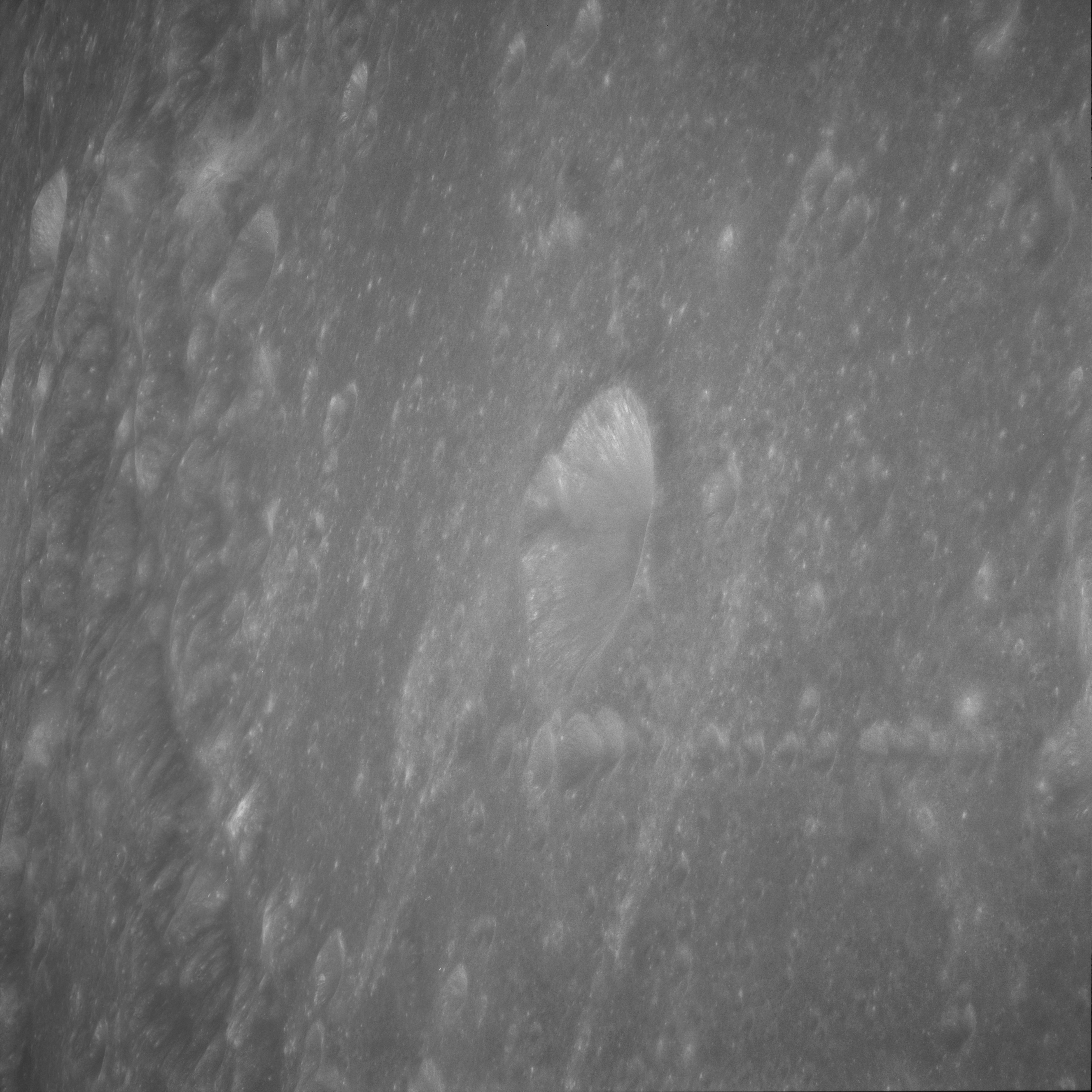 Higher solar elevation than the 08 August image. Good track definition to Little West. Just a hint of the LRRR and PSEP visible in the 0.5 m/pixel deconvolved version. The raw file is M106719774L. The landing site lat/long is 0.67N/23.47E. The LRO spacecraft was at 0.95N/24.33E.01 October 2009 23:50:40 UTC; Solar El/Az 87.8/195.3; LRO altitude 50 km. (1.8 Mb)Deconvolved, 0.50 m/pixel (4.2 Mb TIF) and 1.0 m/pixel (3.5 Mb TIF) versions by GoneToPlaid.