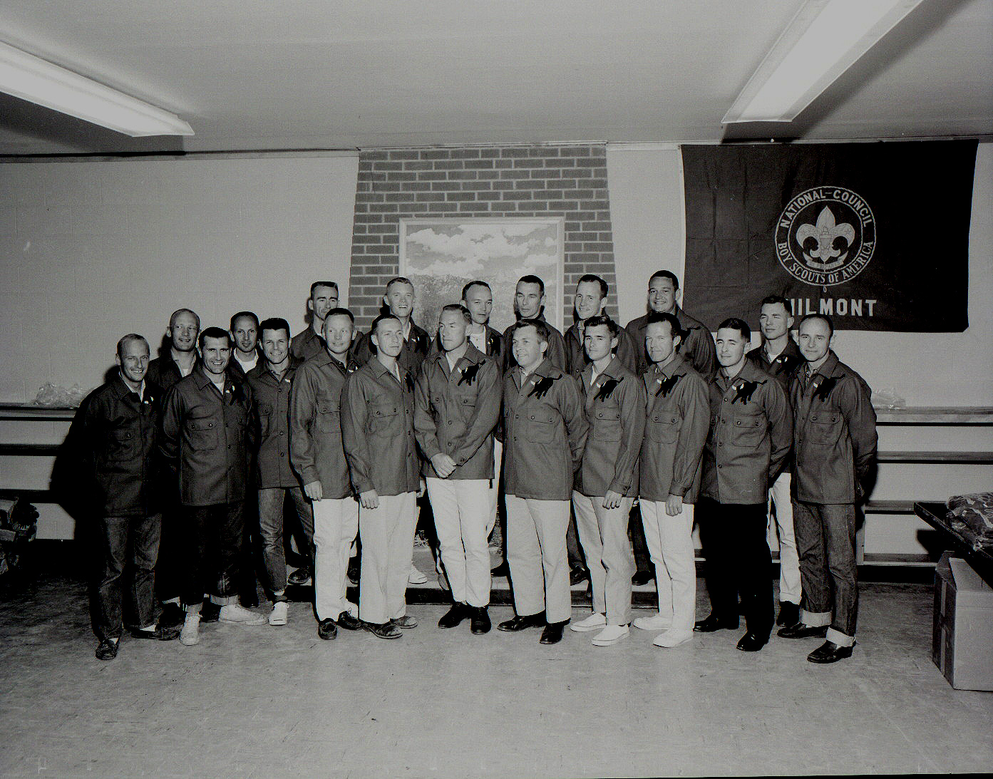 Astronaut reunion at NASA Johnson. See a labeled detail for identifications, some of which were provided by Jack Schmitt. 22 August 1978. Scan by J.L. Pickering.Flight Suits at NASM ( 40k )