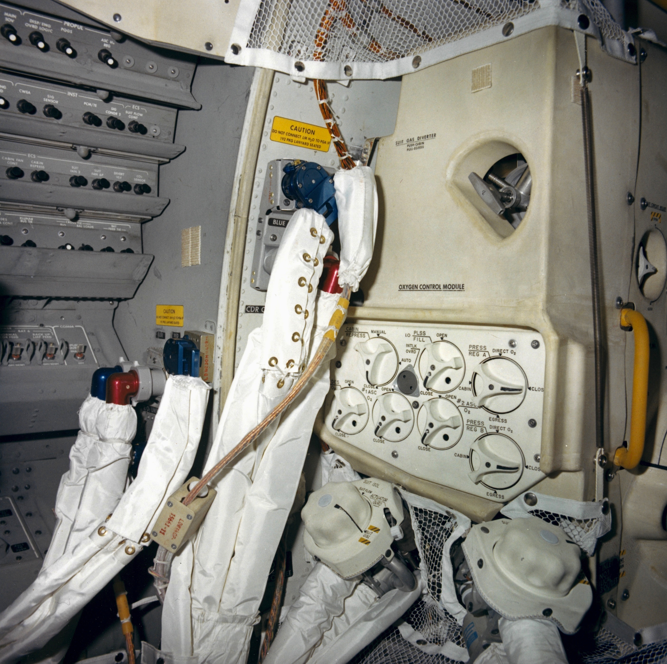 [A detail from a photo taken by Frank O'Brien of a LM simulator at the Cradle of Aviation Museum shows the stowage location for utility straps in the Right Hand Side Stowage Compartment (RHSSC).]129:21:40 Bean: We'll do it. (Pause)