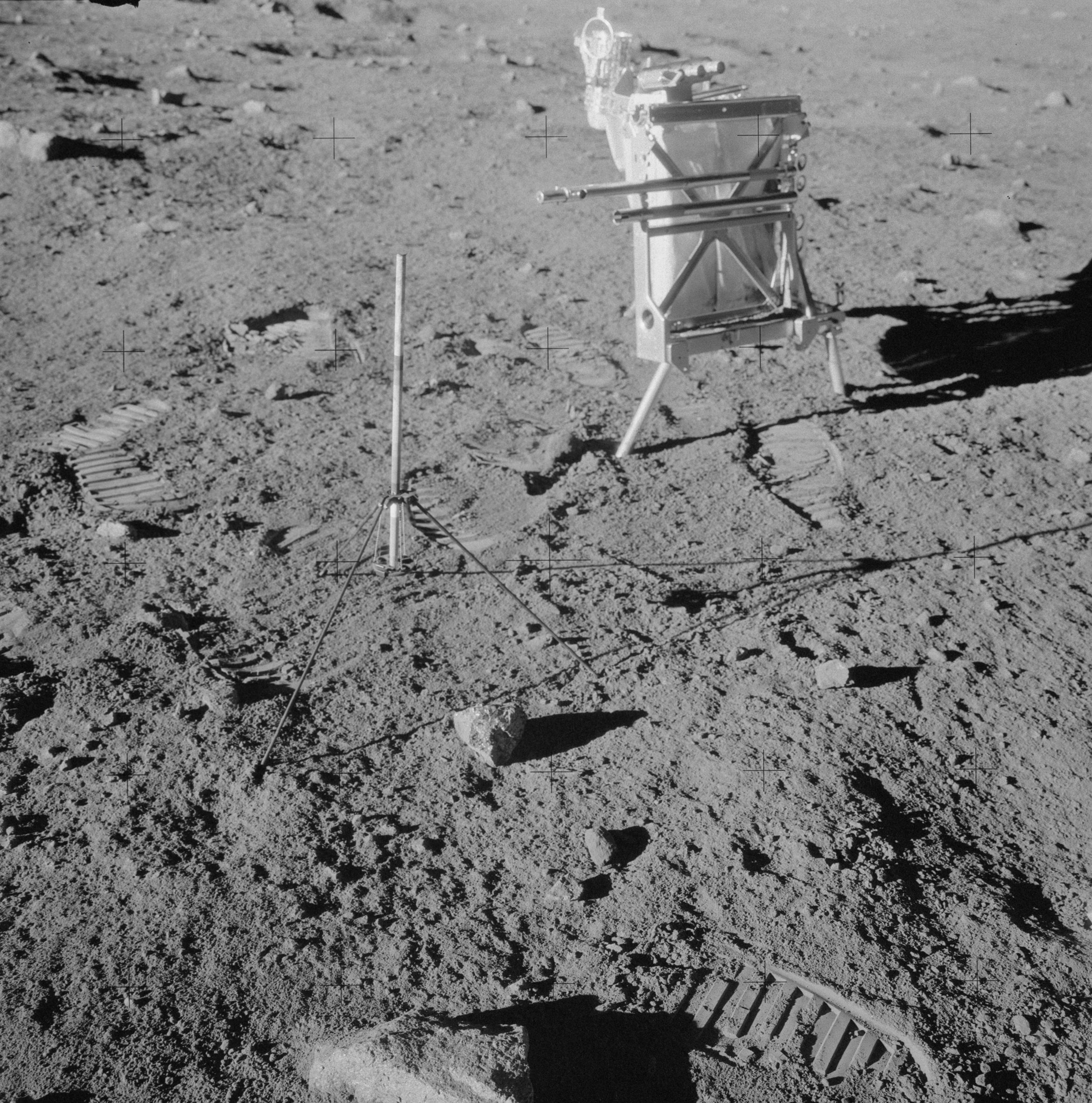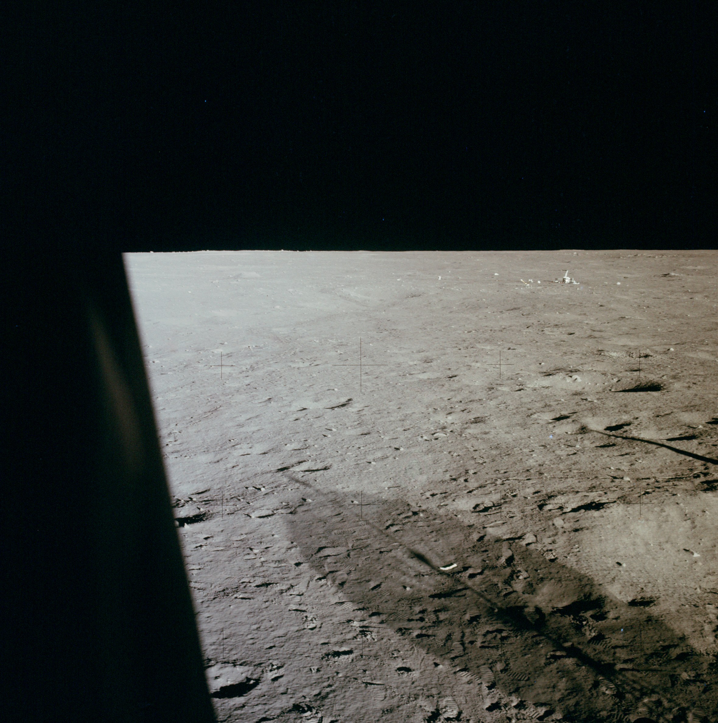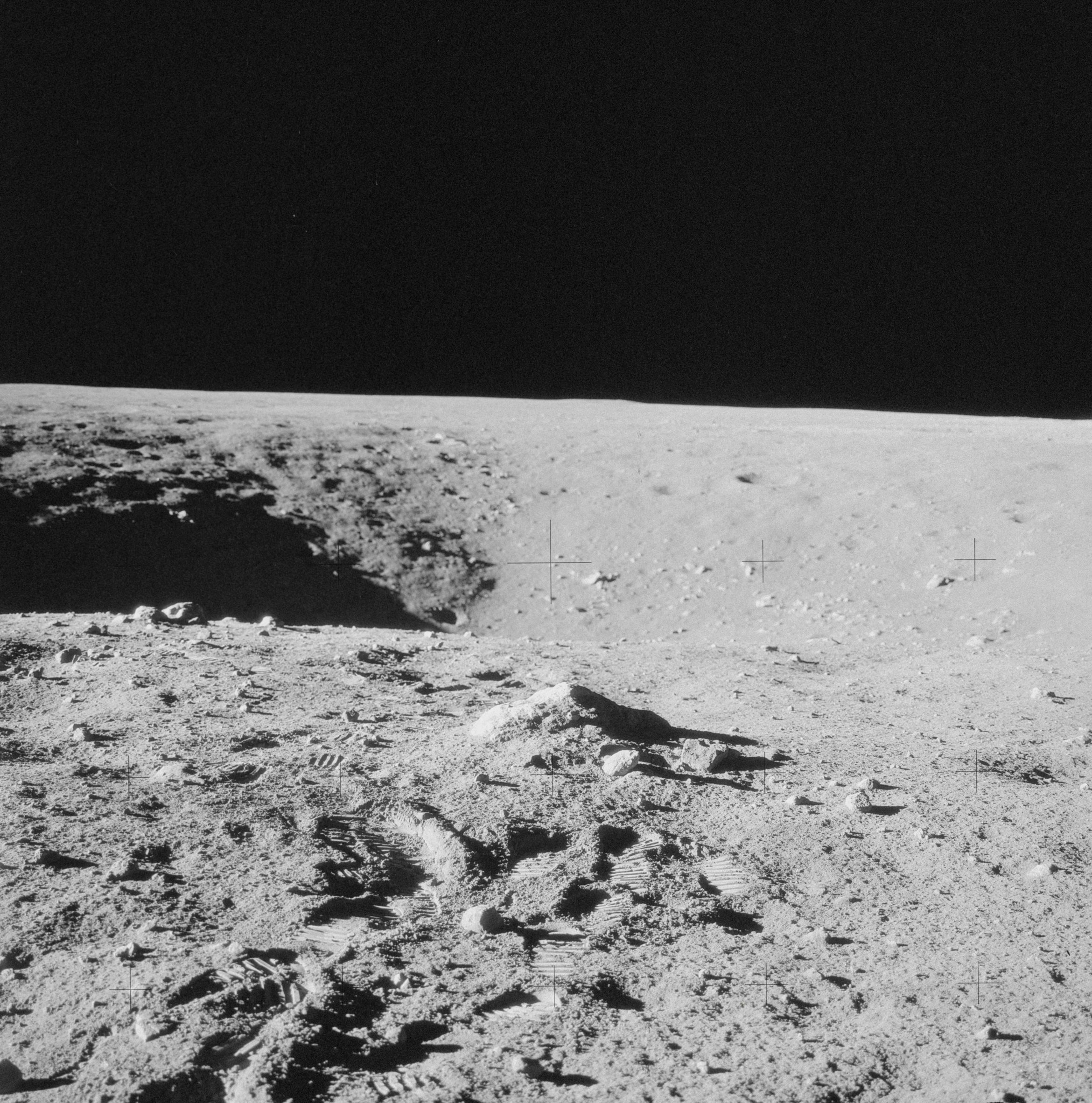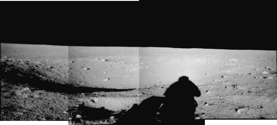 The raw image is M114104917R. See, also, a labeled version ( 0.8 Mb ). A labeled 2x detail shows features at the ALSEP site. Late in EVA-1, Pete and Al ran out to the rim of Middle Crescent Crater, where Pete took a pair of partial pans showing the crater. A variety of craters and boulders in the crater are identified in a comparison ( 5.1 Mb ) between Pete's first pan and the 29 Nov 2009 LROC image.09 January 2010 04:27:29 UTC; Solar El/Az 9.3/270.5; LRO altitude 43.1 km; resolution 0.49m/pixel ( 8.4 Mb )Deconvolved, 0.25 m/pixel (3.1 Mb TIF) and 0.5 m/pixel (3.4 Mb TIF) versions by GoneToPlaid.