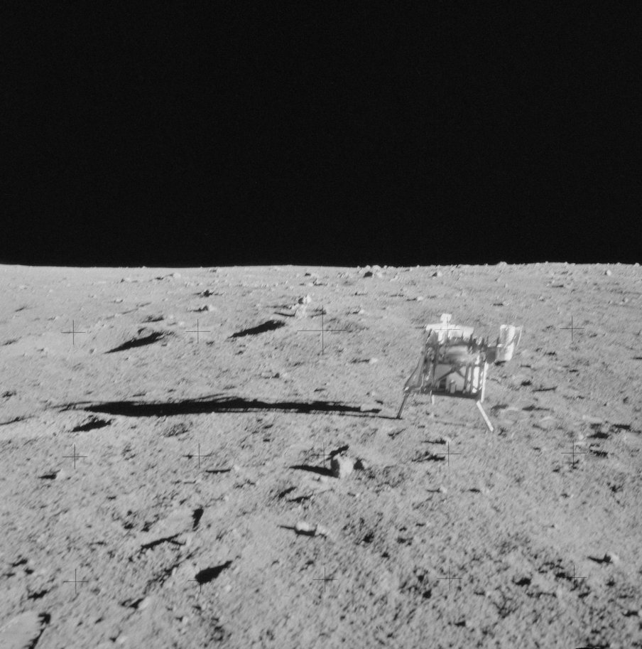 Dick Gordon spotted both the LM and Surveyor III on the surface, using the Command Module sextant during his pass over the landing site at 114:22:28. At Houston's suggestion, he used the DAC to film his next pass and this is a frame from that film sequence. At that time, the solar elevation was about 8.1 degrees and the LM sahdow about 160 feet. Ulli Lotzmann provided the frame and a labeled version.