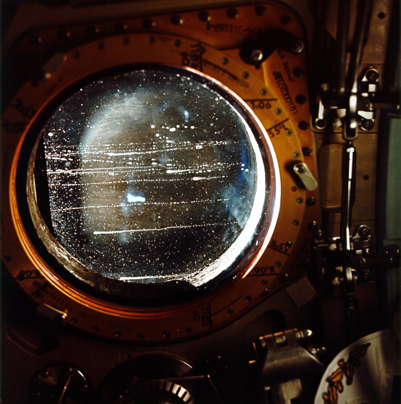 According to National Space Science Data Center document NSSDC-70-11 (July 1970), this photo shows the 'fouled hatch window; streaks go (left) away from the CMS cone (right)'. This photo was taken inside the Command Module during the translunar coast. Scans by Kipp Teague.AS12-50-7374 ( 85k or 462k )