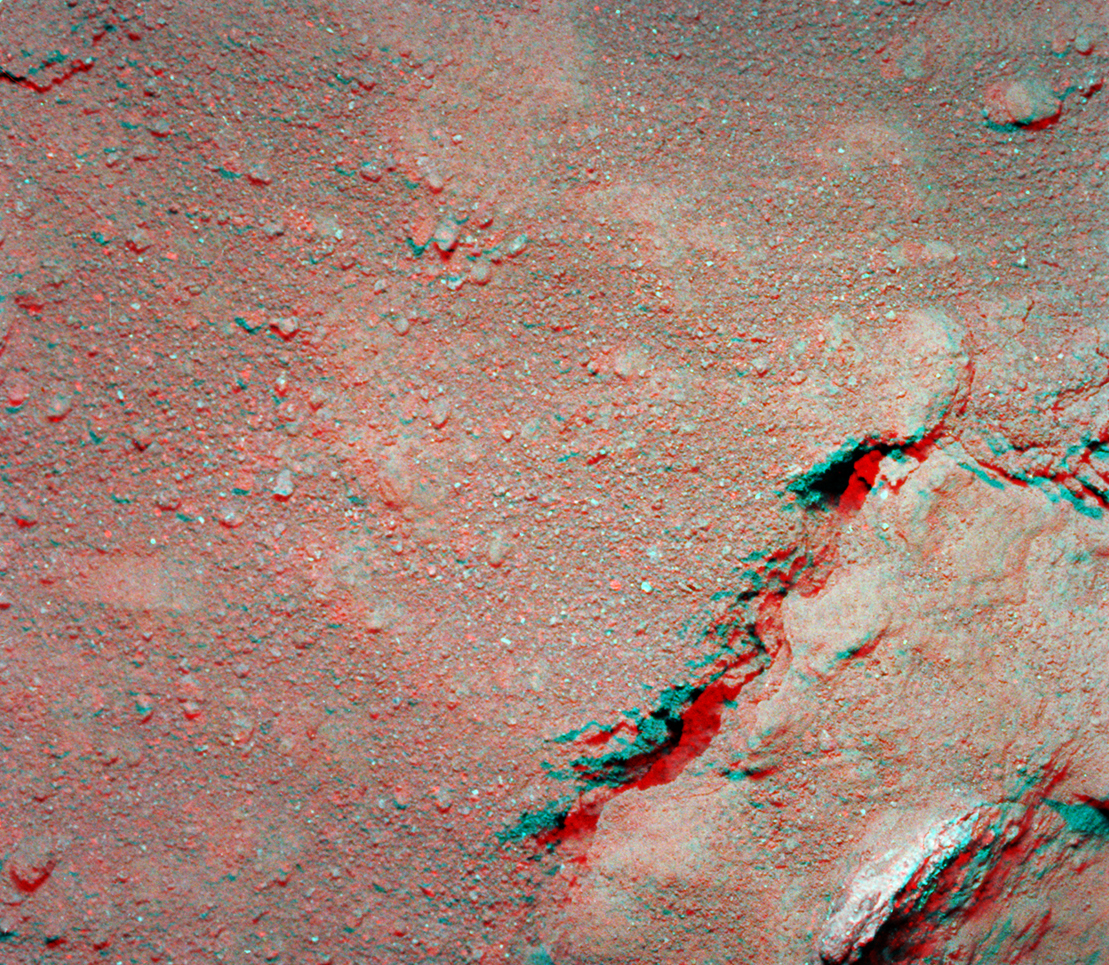 Many of the zap pits are surround by light-colored halos, which Jack Schmitt says represents a region where plagioclase crystals have been shattered. Red-blue anaglyph created by Erwin D'Hoore.AS12-57-8447 ( 1.9Mb )