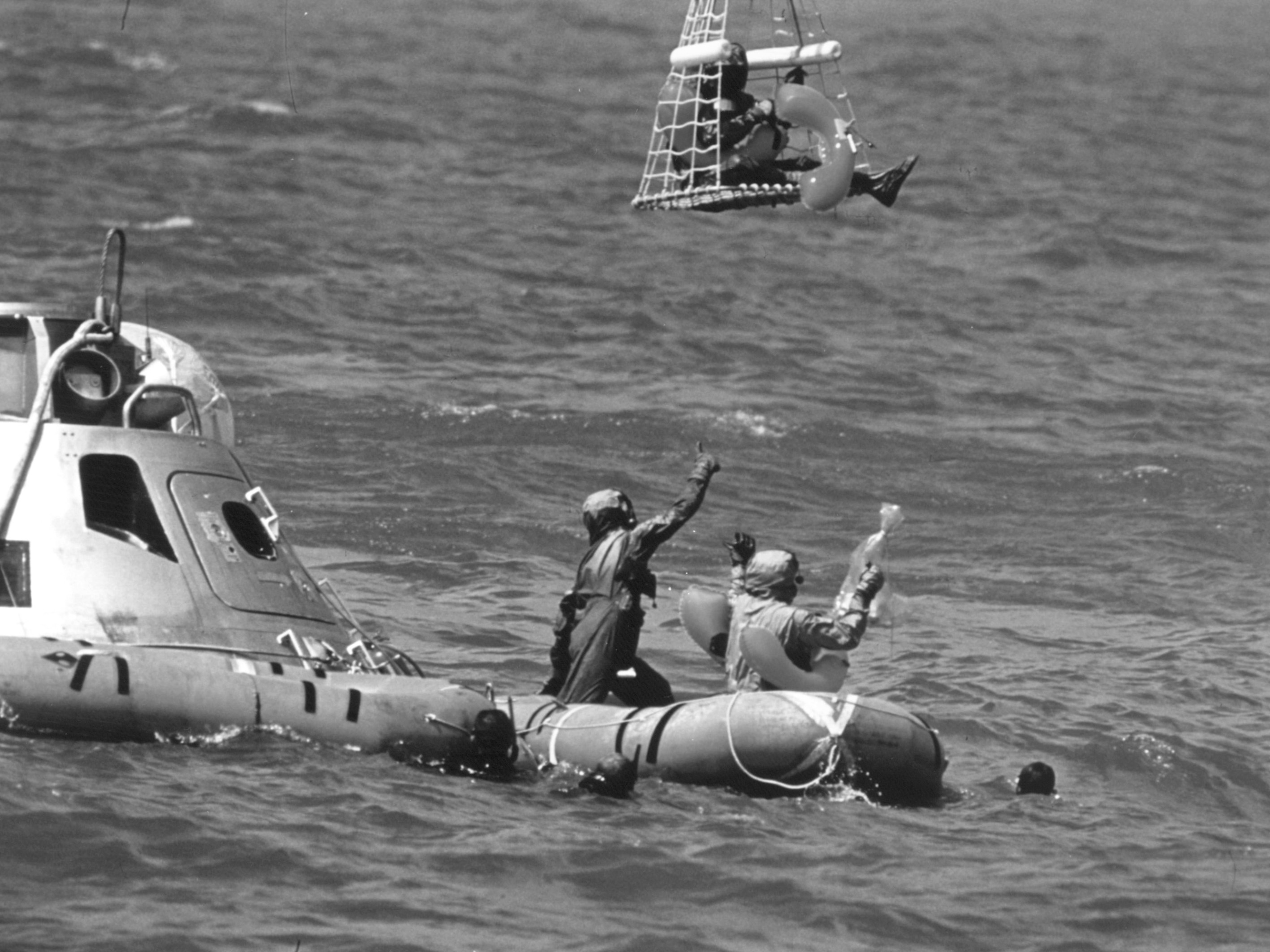 A Navy diver helps Al Bean into the recovery raft. Pete Conrad is at the far right and Dick Gordon is at the center. Note the diver in the water to the left of the raft taking pictures. Photographs are also being taken from the helicopter. 24 November 1969. Scan by Ed Hengeveld.S69-22271 ( 170k )