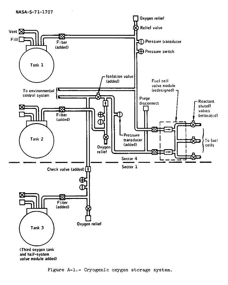 a. The internal construction of the cryogenic oxygen tanks was modified as described in the following table.A.1.4 Instrumentationb. A third cryogenic oxygen storage tank was installed in sector 1 of the service module. This tank supplied oxygen to the fuel cells and could be used simultaneously with the two tanks in sector 4. A new isolation valve was installed between tanks 2 and 3 to prevent the loss of oxygen from tank 3 in the event of damage to the plumbing for tanks 1 and 2. The closed isolation valve also would have prevented the flow of oxygen from tank 3 to the fuel cells. However, tank 3 could have supplied the environmental control system with the isolation valve closed while the auxiliary battery, mentioned in paragraph e, was the source of electrical power.