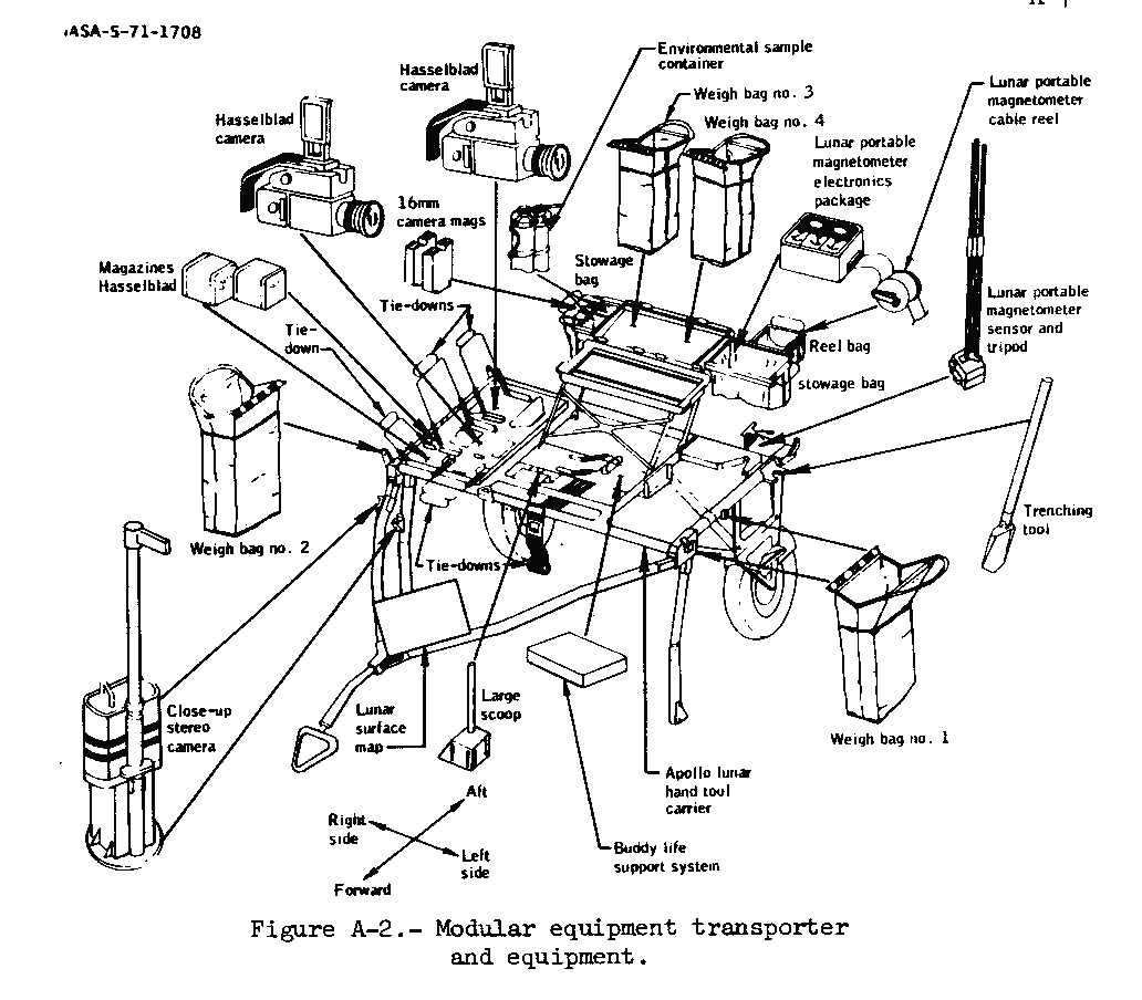 Support structure was added to the descent stage for attachment of the laser ranging retro-reflector to the exterior of quadrant 1 and attachment of the lunar portable magnetometer to the exterior of quadrant (see section A.4 for description of experiment equipment). A modular equipment transporter was attached to the modular equipment stowage assembly in quadrant 4. This system (fig. A-2) was provided to transport equipment and lunar samples, and to serve as a mobile workbench during extravehicular activities. The transporter was constructed of tubular aluminum, weighed 25 pounds, and was designed to carry a load of about 140 pounds, including about 30 pounds of lunar samples.