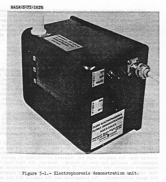 Postmission review of the filmed data reveals that the red and blue organic dyes separated as expected; however, separation of the hemoglobin and DNA cannot be detected. Postflight examination of the apparatus indicates that the samples were not released effectively to permit good separation, causing the dyes to streak. However, the fact that the dyes separated supports the principle of electrophoretic separation and shows that sedimentation and convection effects are effectively suppressed in the space environment. The hemoglobin and DNA samples did not separate because they contained bacteria that consumed the organic molecules prior to activation of the apparatus.