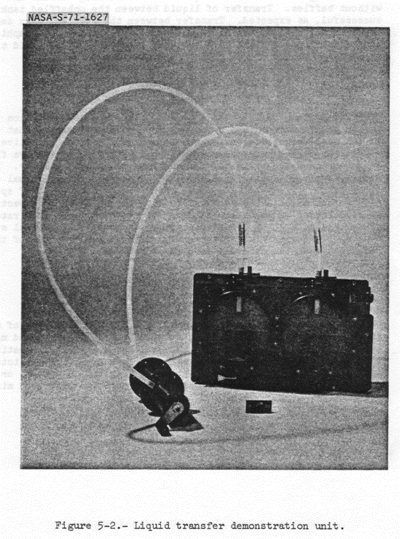 The liquid transfer demonstration (fig. 5-2) was designed to evaluate the use of tank baffles in transferring a liquid from one tank to another under near-zero-gravity conditions. The demonstration was conducted using two sets of tanks, one set containing baffles and the other without baffles. Transfer of liquid between the unbaffled tanks was unsuccessful, as expected. Transfer between the baffled tanks demonstrated the effectiveness of two different baffle designs. Photographic data indicate that both designs were successful in permitting liquid transfer.