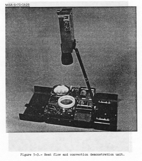 The purpose of the heat flow and convection demonstration (fig. 5-3) was to obtain data on the types and amounts of convection that can occur in the near-weightless environment of space. Normal convective flow is almost suppressed under these conditions; however, convective fluid flow can occur in space by means of mechanisms other than gravity. For instance, surface tension gradients and, in some cases, residual accelerations cause low-level fluid flow. -Four independent cells of special design were used to detect convection directly, or detect convective effects by measurement of heat flow rates in fluids. The heat flow rates were visually displayed by color-sensitive, liquid crystal thermal strips and the color changes filmed with a 16-mm data camera. Review of the film has shown that the expected data were obtained.