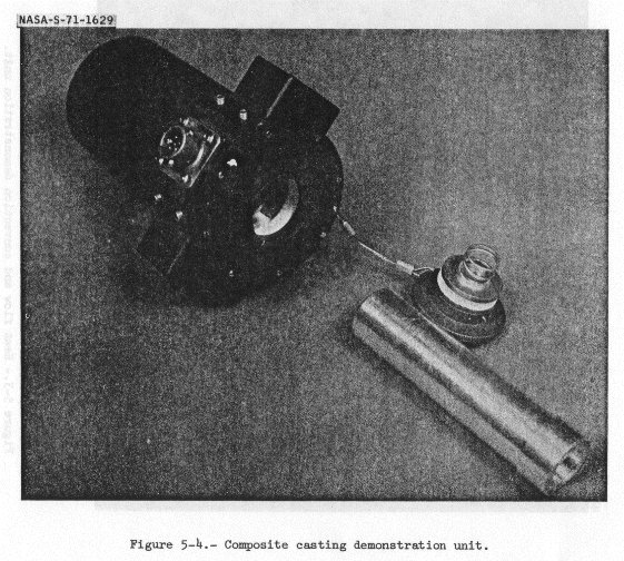This demonstration was designed to evaluate the effect of near-zerogravity on the preparation of cast metals, fiberstrengthened materials, and single crystals. Specimens were processed in a small heating chamber (fig. 5-4) and returned for examination and testing. A total of 11 specimens was processed. No problems with the procedures or equipment were noted. An xray of the samples verified that good mixing occurred.