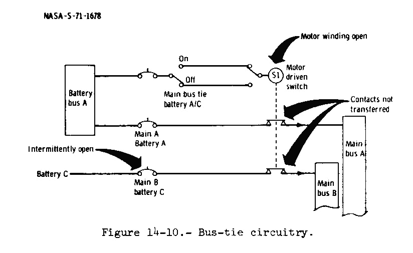 The motor switch failure discussed in section 14.1.6 should have resulted in main buses A and B being energized after the motor switch was commanded open (fig. 14-10). Postflight continuity checks, however, showed that there was an open circuit between battery C and main bus B and that the main bus B circuit breaker for battery C was intermittent.