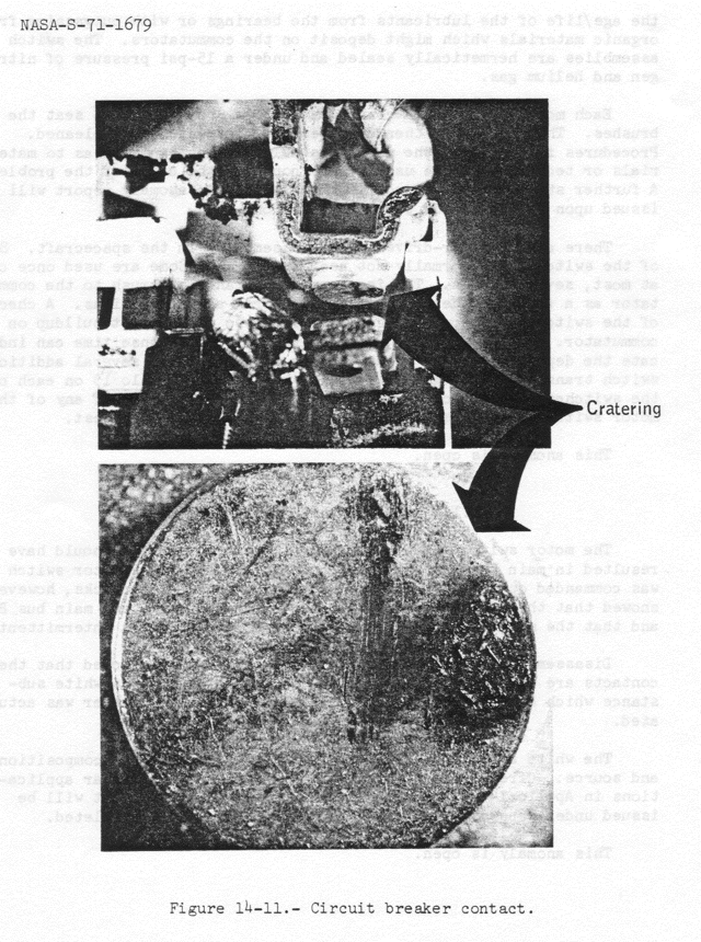 Disassembly and inspection of the circuit breaker showed that the contacts are cratered (fig. 14-11). The crater contains a white substance which held the contacts apart when the circuit breaker was actuated.