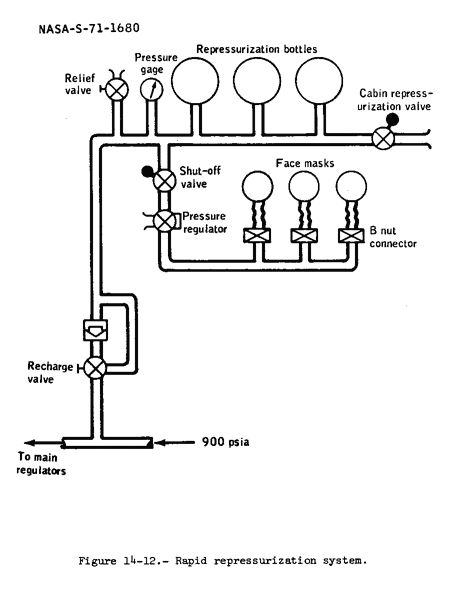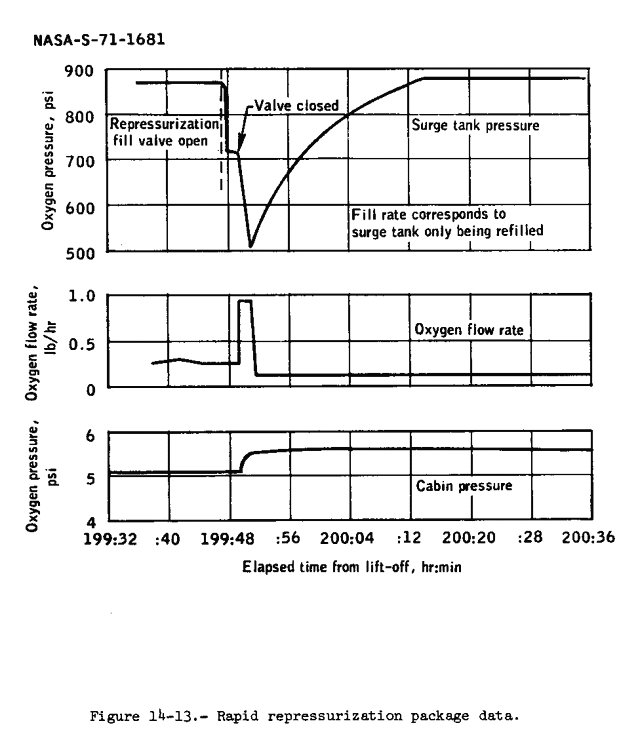 Repressurization of the three storage bottles in the rapid repressurization system (fig. 14-12) was required three times in addition to the normal repressurizations during the mission. The system required repressurization once in lunar orbit and twice during,the transearth coast phase. Just prior to the first of the transearth coast repressurizations, the system had been used (face mask checks) and refilled (fig. 14-13). In this instance, the Pill valve was closed before the system was fully recharged. Calculations from the surge tank pressure data indicate that the repressurization package was at approximately 510 psi at 199 hours 48 minutes and was only recharged to about 715 Psi (fig. 14-13). The cabin indication of the repressurization package pressure would have indicated a higher pressure because of the temperature rise of the compressed gas. The crew noted a value of about 700 Psi (due to temperature stabilization) at approximately 21-1 hours and recharged the system again.