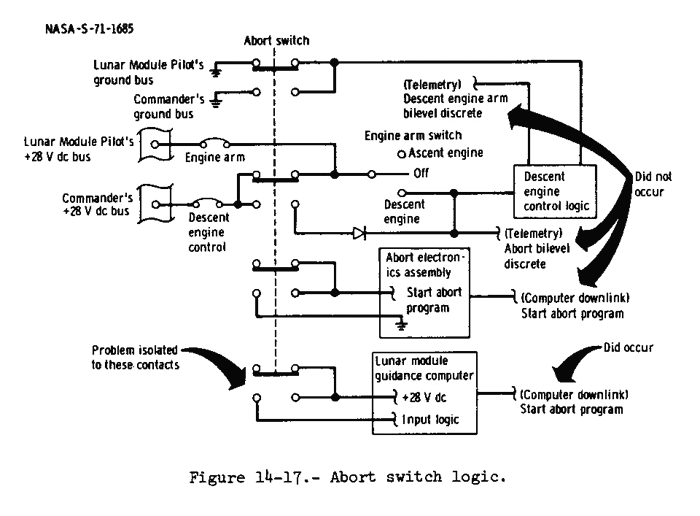 Prior to descent, the primary guidance computer received an abort command four different times. The computer would have reacted if the descent program had been initiated. The failure was isolated to one set of contacts of the abort switch (fig. 14-17) because the abort command appeared only on the lunar module primary guidance computer downlink (telemetry) and not on the abort guidance computer downlink (telemetry) or the telemetry bilevel discretes associated with the descent engine control logic. Recycling the switch or tapping the panel removed the signal from the computer. To prevent an unwanted abort during powered descent, a computer program was developed and verified within 2 hours, and in time to be manually inserted into the lunar module computer prior to powered descent initiation. The program would have allowed the lunar module computer to ignore the abort command, had it appeared during powered descent.