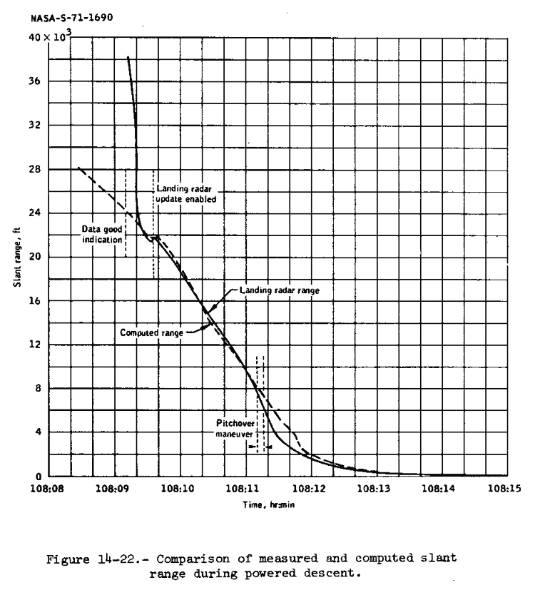 Prior to lunar descent, the VHF ranging and rendezvous radar range measurements correlated closely. However, during the time period preceding terminal phase initiation, the VHF ranging system indicated erroneous measurements. During this same time period, numerous range tracking dropouts also occurred. The range measurements were in error by 5 to 15 miles when compared with the rendezvous radar range measurements (fig. 14-7). The VHF ranging data presented in the figure results from a number of different acquisitions. After terminal phase initiation, the signal strength, as indicated by the lunar module receiver automatic gain control voltage measurement, was adequate and VHF ranging operation was normal.