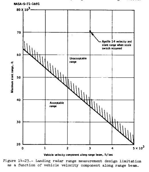 Two conditions occurred during the landing radar operation which were not expected; however, they were not abnormal. The first condition occurred approximately 6 minutes after initial actuation of the landing radar. The system switched to the low-range scale, forcing the trackers into the narrow-band mode of operation. This was corrected by recycling the main power circuit breaker which switched the radar to high scale. Figure 14-21 shows the radar scale switching logic. The radar then locked on and "velocity-data-good" and "range-data-good" indications were transferred to the computer. The "velocity-data-good" signal is generated when the Doppler trackers lock on and the "range-data-good" signal is generated when the range tracker also locks on.