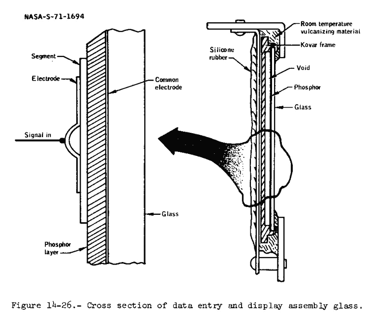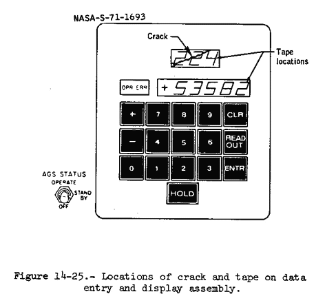 Corrective action consists of applying a clear plastic tape prior to flight on the glass of the electroluminescent windows above the keyboard (fig. 14-25), like that previously used on the mission timer windows. The tape is to prevent dislodging of any glass particles if cracks occur in the future, as well as help prevent moisture from penetrating the electroluminescent segments should a crack occur. The presence of moisture would cause the digit segments to turn dark in about 2 hours if voltage were applied to a cracked unit, making the assembly unreadable.