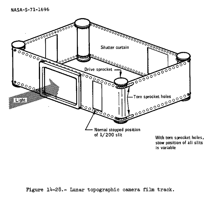 Postflight tests with the flight camera showed satisfactory operation in all simulated environments (pressure, thermal-, and vibration) at one-g. An intermittent failure was found in a transistor in the shutter control circuit (fig. 14-27). The transistor was contaminated with a loose piece of aluminum 0.130 inch by 0.008 inch, which was foreign to the transistor material. With a shorted tra~sistor, 28 volts is applied continuously to the shutter drive circuit, causing continuous shutter operation, independent of the intervalometer and independent of the single, auto, or standby mode selections. The sprocket holes in the 1/200 slot in the shutter curtain were torn as a result of the prolonged, continuous, high-speed shutter operation (fig. 14-28).