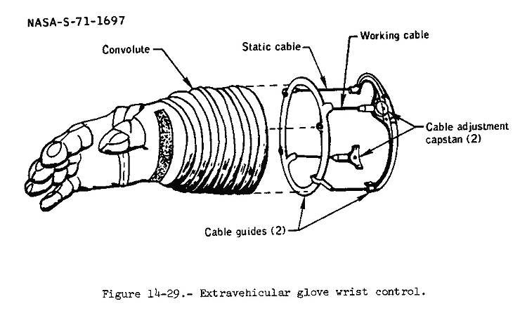After suit pressurization for the second extravehicular activity, the Lunar Module Pilot reported that his right glove had pulled his hand to the left and down and that he had not had this trouble during the first extravehicular activity period. The condition was a nuisance throughout the second extravehicular activity period. Initial indications from the Lunar Module Pilot were that a cable had broken in the glove (fig. 14-29).