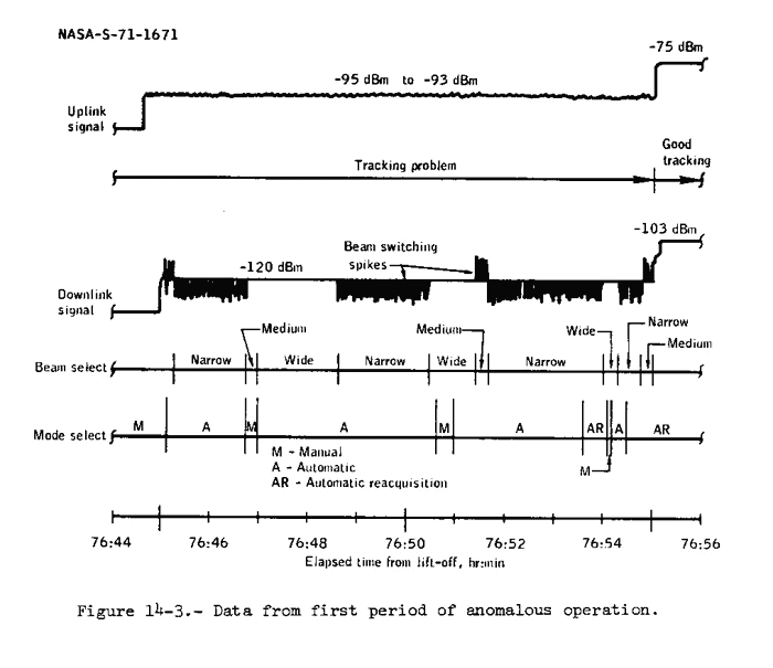 a. 76:45:00 to 76:55:00An instrumentation problem with the antenna readout occurred for about 3 hours early in the mission when an error of about 30 degrees existed. Subsequently, the readings were normal. A mechanical interference in the instrument servos is the most likely cause. The instrument servos are an independent loop which drive the antenna pitch and yaw meters in the command module. No corrective action is planned since the servos do not affect the antenna performance for any modes of operation.b. 92:16:00 to 93:22:00