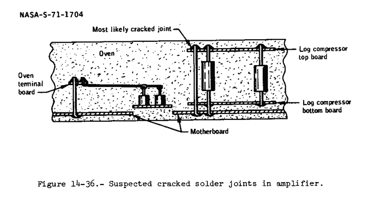 There are 10 such solder joints for each geophone (fig. 14-36): four on the oven terminal board, four on the mother board, one on the top board of the log compressor module, and one on the bottom board of the log compressor module. The one most likely to fail first is on the top board of the log compressor module. Continuity at the joint recovers as long as the crack closes during the lunar day.