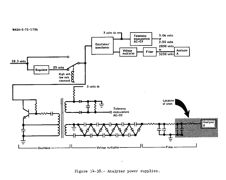 The voltage measurement reading on the analyzer B power supply (fig. 14-38) became erratic on April 8, 1971, and the analyzer B science data were lost.