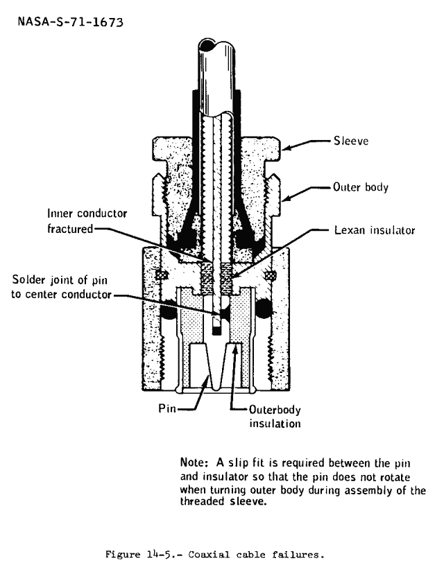In support of this cause, five bad coaxial center conductors have been found. Also, a coaxial connector was disconnected on the antenna and the effect in the beam occurred. There are two causes of the problem with the center conductor, both of which occur during cable-to-connector assembly (fig. 14-5). The sleeve is assembled to the cable, a Lexan insulator is then slipped over the center conductor, and the pin is inserted over the center conductor and soldered. If the wire gets too hot during soldering, the Lexan grows and no longer fits loosely through the hole in the outer body. When this occurs and the outer body is screwed onto the sleeve, the wire can be twisted and the center conductor may fail.