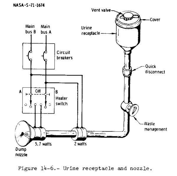 After transposition and docking and prior to initiating passive thermal control, the crew indicated that the urine nozzle (fig. 14-6) was obstructed. The*same condition occurred several other times during the mission and,, in each case, the dump nozzle had not been exposed to sunlight for prolonged periods.