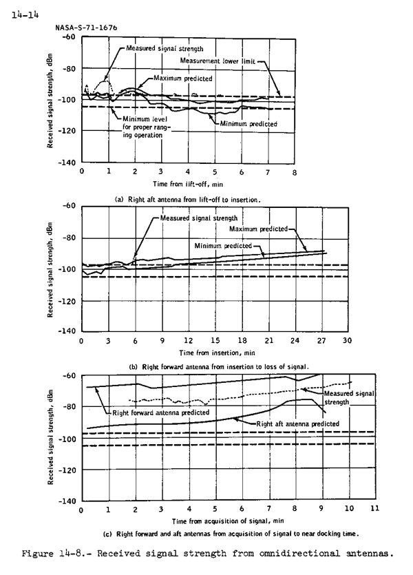 Figure 14-8(b) shows that the signal strength should have been on scale subsequent to about 10 minutes after insertion. Figure 14-8(c) shows that the measured signal strength was below that expected for the right-forward antenna, the one which the checklist called out to be used, from insertion to docking and above that predicted for the right-aft antenna for this same time period. This indicates that the proper antenna was selected, but some condition existed which decreased the signal strength to the lunar module receiver.
