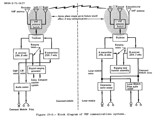The lower-than-normal RF link performance was a two-way problem (voice was poor in both directions); therefore, certain parts of the VHF system are prime candidates for the cause of the problem. Figure 14-9 is a block diagram of the VHF communications system as configured during the rendezvous phase of the mission. Also shown are those areas in which a malfunction could have affected the two-way RF link performance. A single malfunction in any other area would have affected oneway performance only.