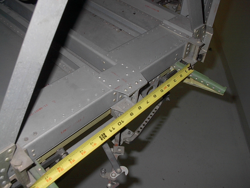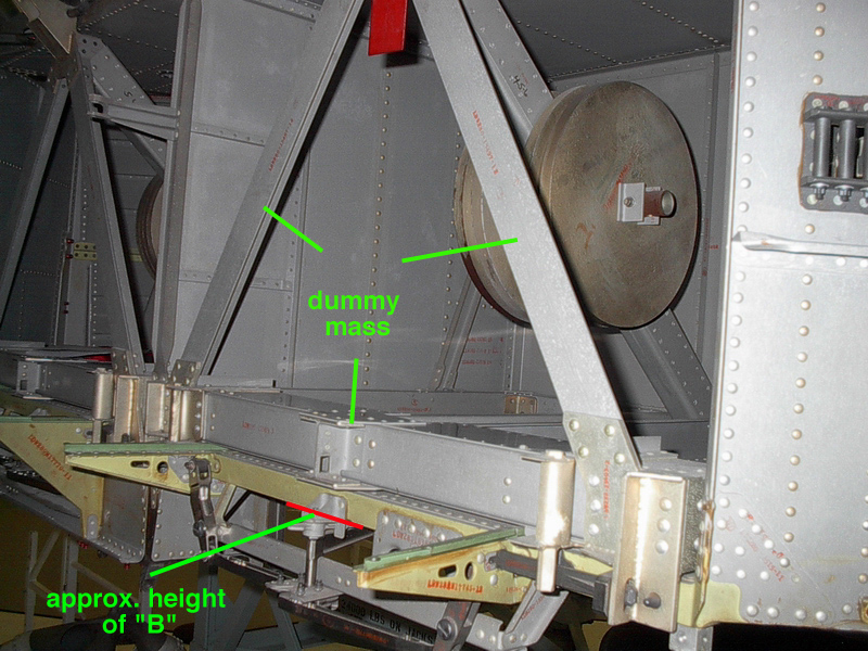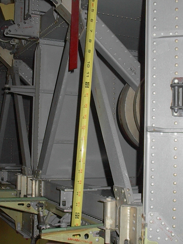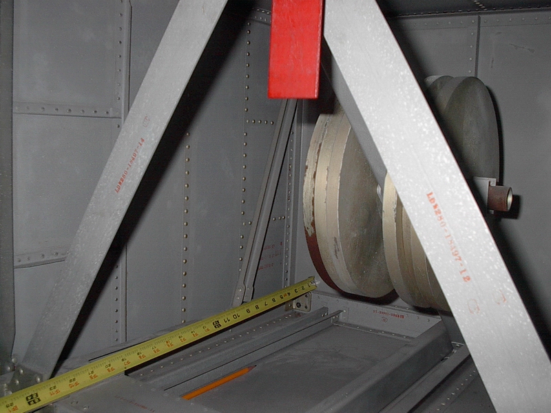 LTA-1-SEQ-01 shows the two-compartment SEQ Bay from the right side. Frank writes, "Note the small volumes of the compartments. The inverted 'V' structures are part of the 'dummy masses' used to simulate the presence of ALSEP packages during dynamic testing. No doors are in place, but the ratchet wheels for the tapes used to lower the packages are there. It is unclear what the function is of the yellow brackets at the bottom of the bay, although they are certainly not part of the dummy masses. I'm standing approximately where the minus-Z strut would be." Apollo 12 counterparts of the yellow brackets are labeled in the detail from AS12-46-6785. There are numerous other similarities.LTA-1-SEQ-03 shows more detail of the lower lip of the righthand compartment. I have not been able to identify a part of the LTA-1 structure that corresponds exactly to point B in 6785. A comparison suggests that the vertical position of B is close to that of the lower edge of the horizontal yellow band in the LTA photo, as indicated by the red line drawn on the image.